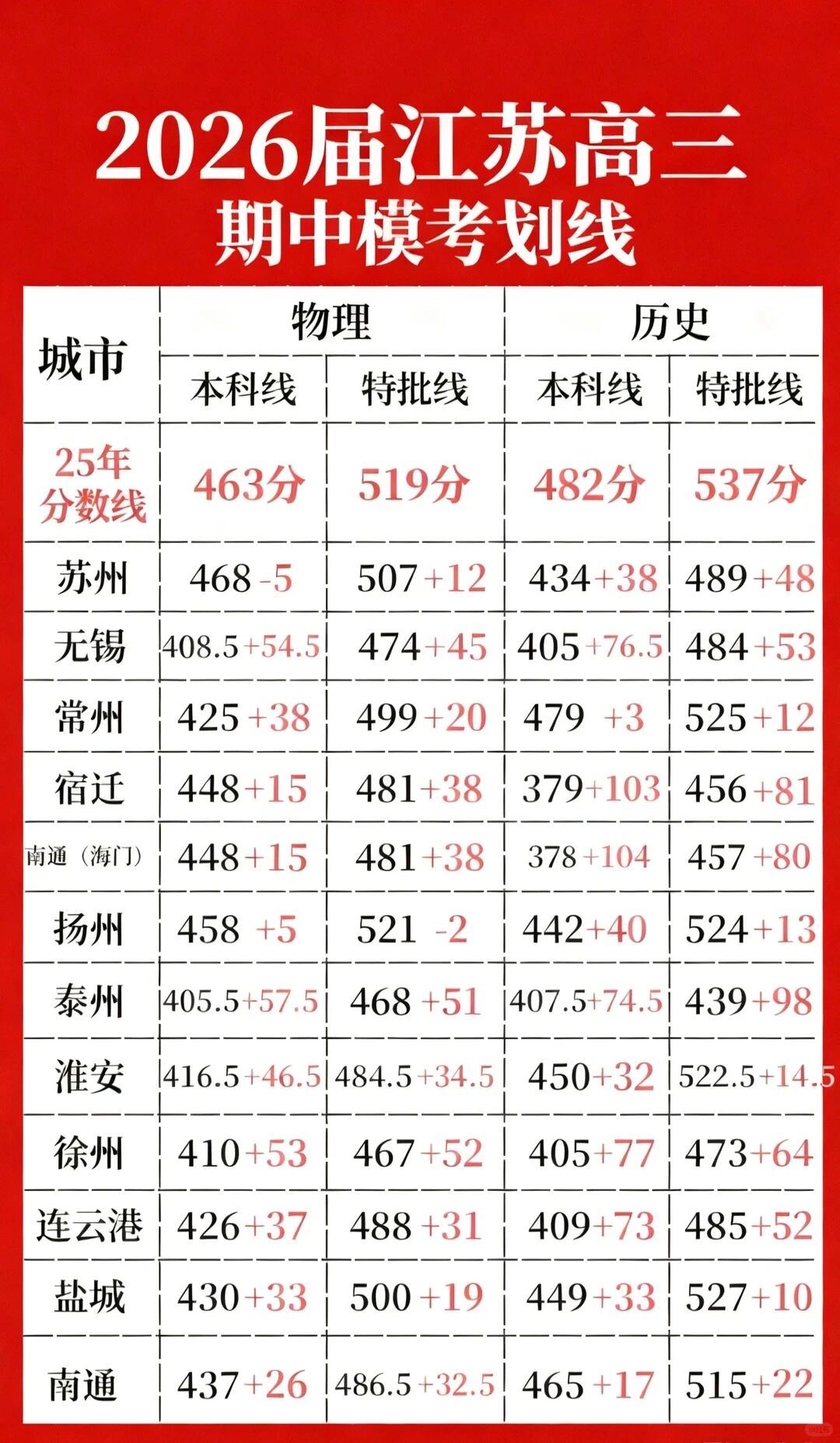 当前江苏除镇江市(12月2日开考)外,其余12市2026届高三11月期中模考已落幕。本次模考是首轮复习后的关键检验,各地市均划定了本科线、特批线,但因试题难度、考生水平差异,划线差距明显。