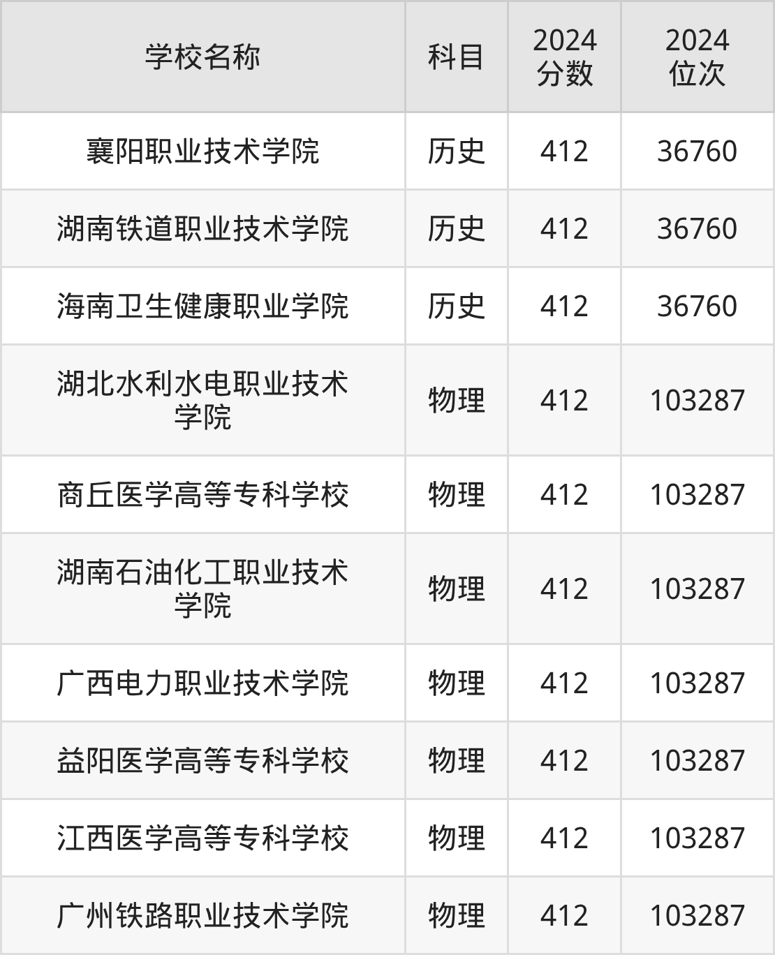 其中,物理组412分位于广东的学校有广州铁路职业技术学院。历史组412分位于湖北的学校有襄阳职业技术学院。