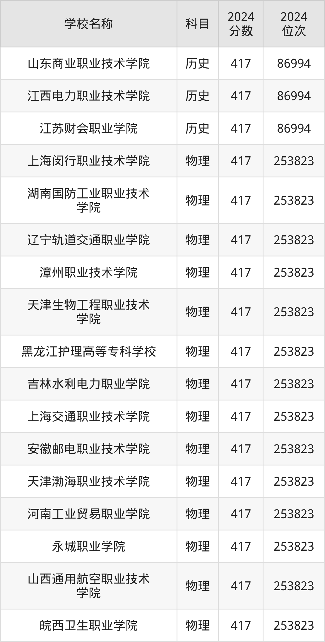其中,物理组417分位于江苏的学校有上海闵行职业技术学院、上海交通职业技术学院。历史组417分位于江苏的学校有江苏财会职业学院。