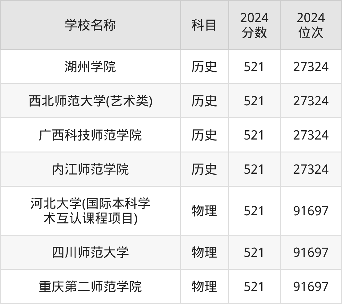 回看2024年河北高考最低分为521分的文科大学名单,物理组有3条数据,历史组有4条数据。