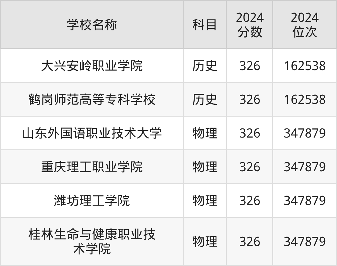 其中,物理组326分位于山东的学校有山东外国语职业技术大学。历史组326分位于黑龙江的学校有大兴安岭职业学院。