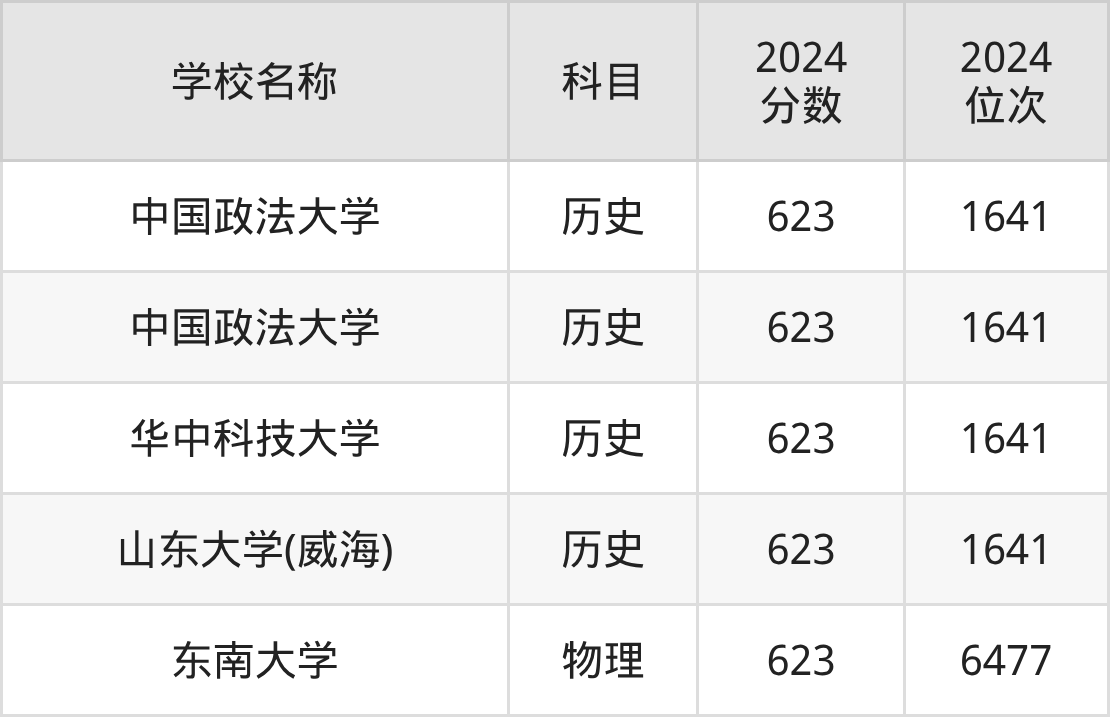 其中,物理组623分位于江苏的学校有东南大学。历史组623分位于江苏的学校有中国政法大学。