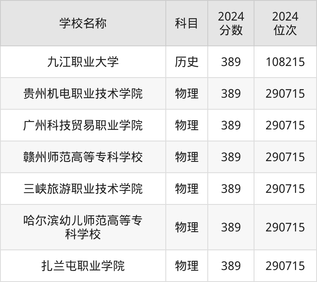 其中,物理组389分位于广东的学校有广州科技贸易职业学院。历史组389分位于江西的学校有九江职业大学。