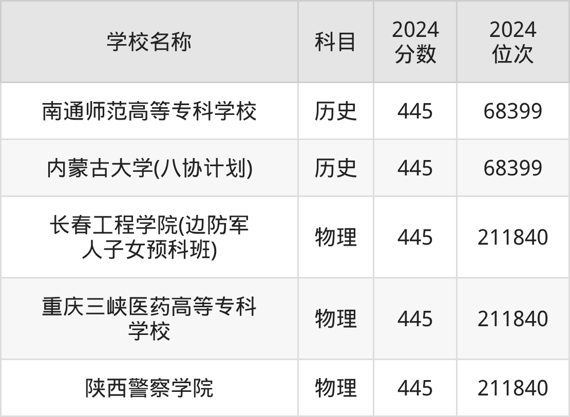 其中,物理组445分位于吉林的学校有长春工程学院(边防军人子女预科班)。历史组445分位于江苏的学校有南通师范高等专科学校。