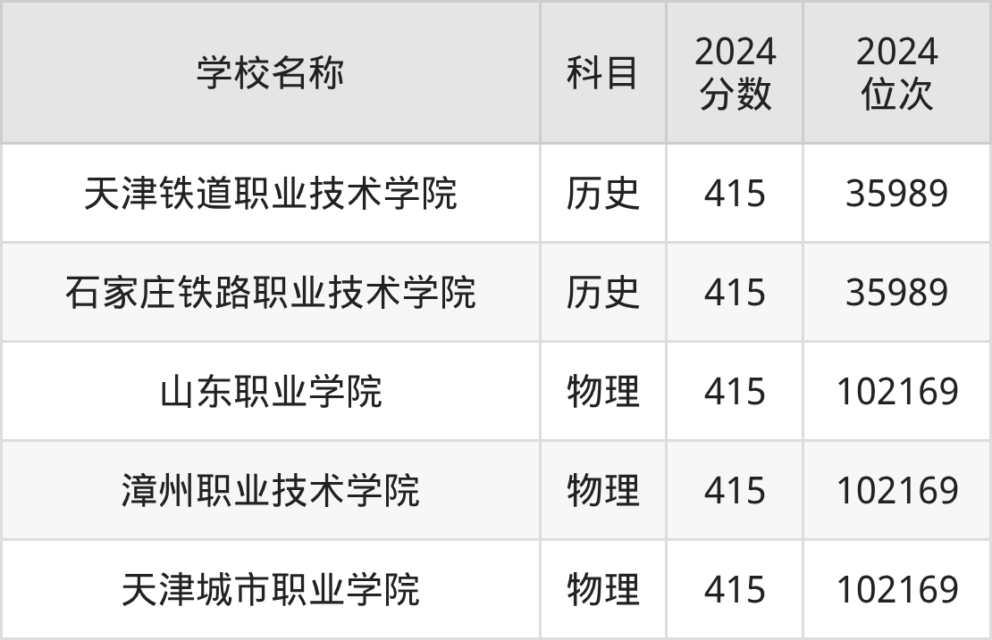 其中,物理组415分位于山东的学校有山东职业学院。历史组415分位于天津的学校有天津铁道职业技术学院。
