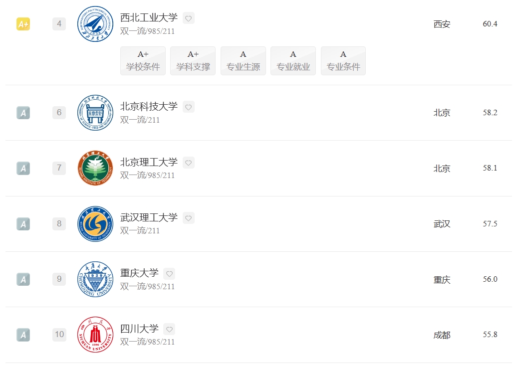 下文将为2024年高考生展示:材料成型及控制工程专业全国排名前十的本科院校。