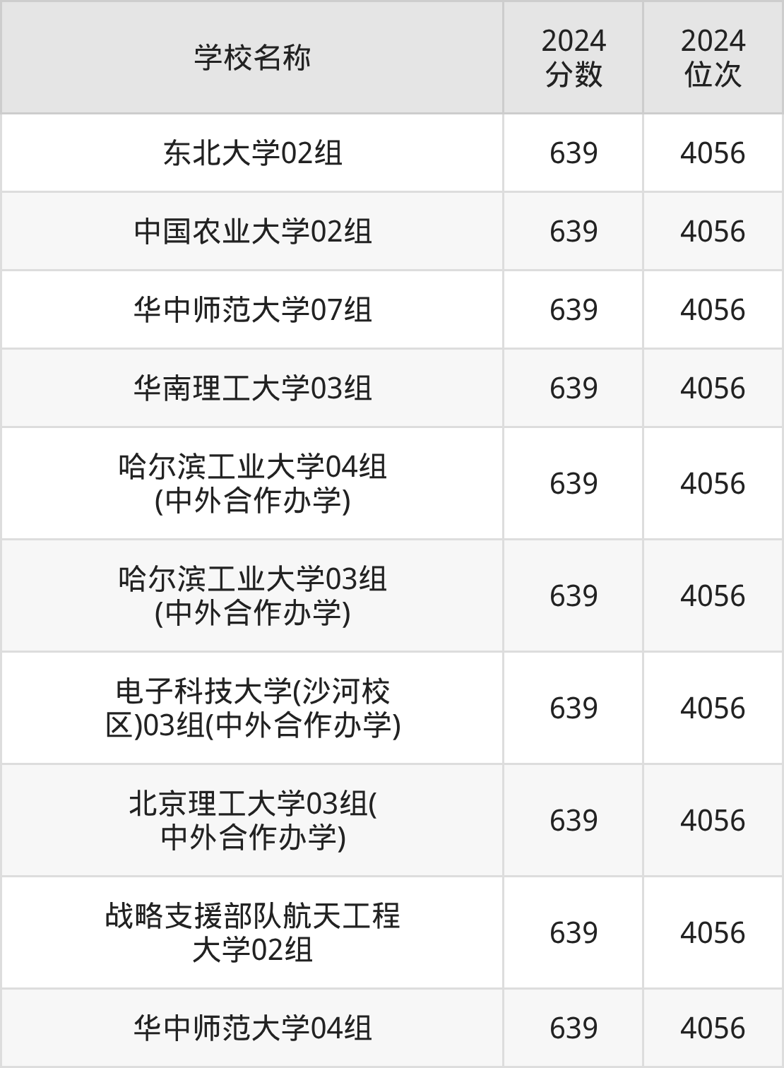 其中,639分位于北京的学校有中国农业大学、北京理工大学、中国人民解放军军事航天部队航天工程大学。