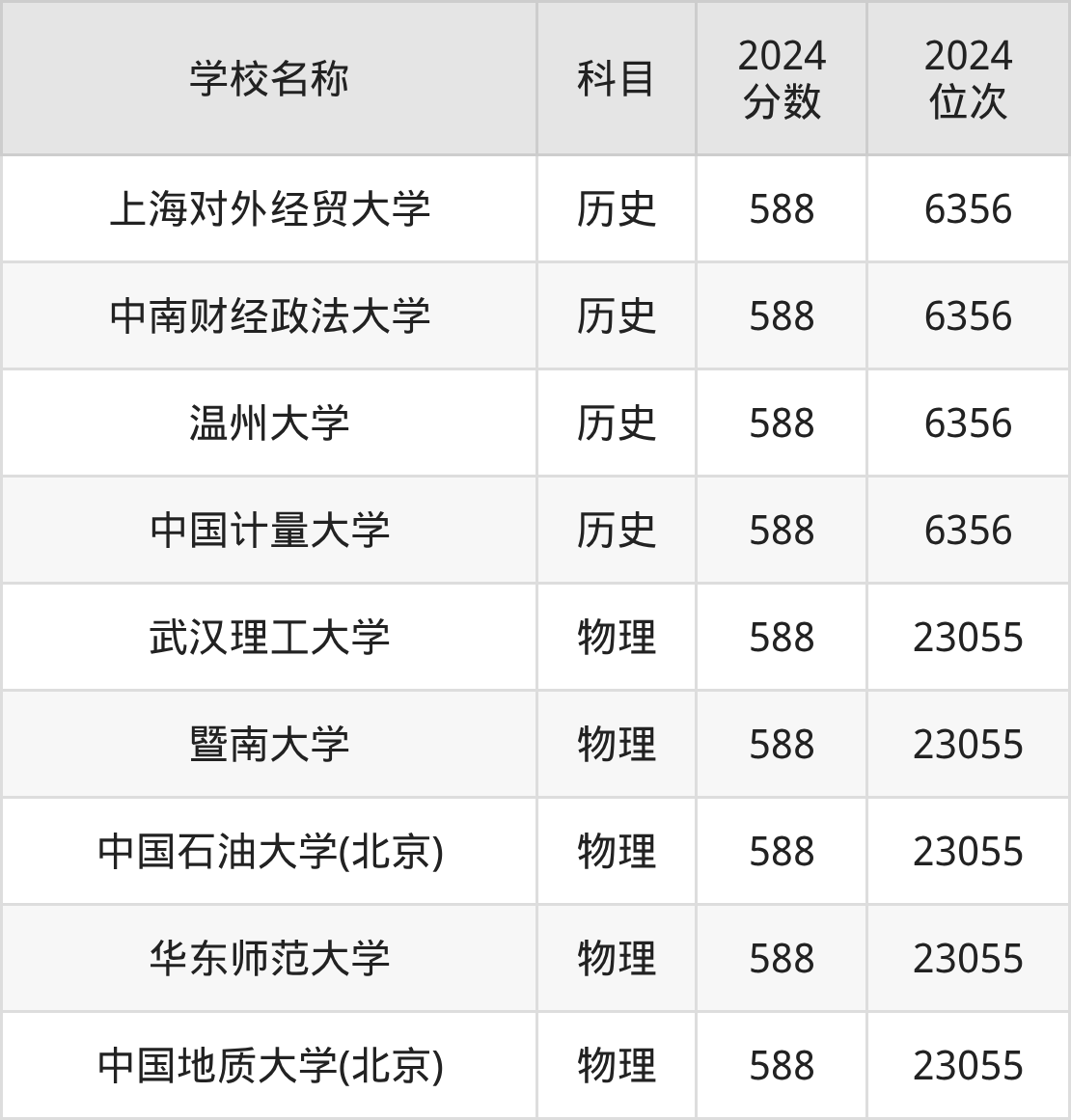 其中,物理组588分位于上海的学校有中国石油大学(北京)、中国地质大学(北京)。历史组588分位于上海的学校有上海对外经贸大学。
