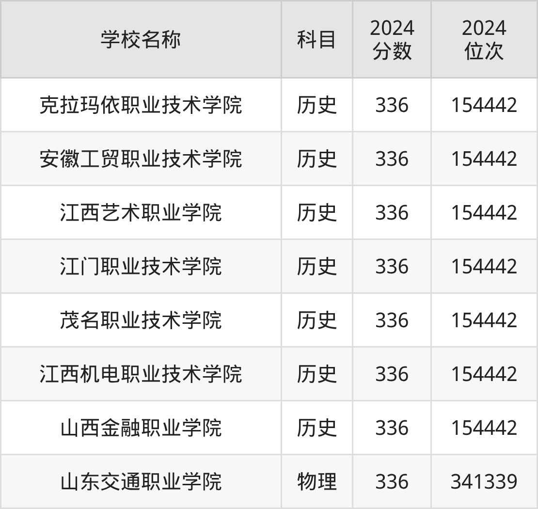 其中,物理组336分位于山东的学校有山东交通职业学院。历史组336分位于广东的学校有江门职业技术学院。