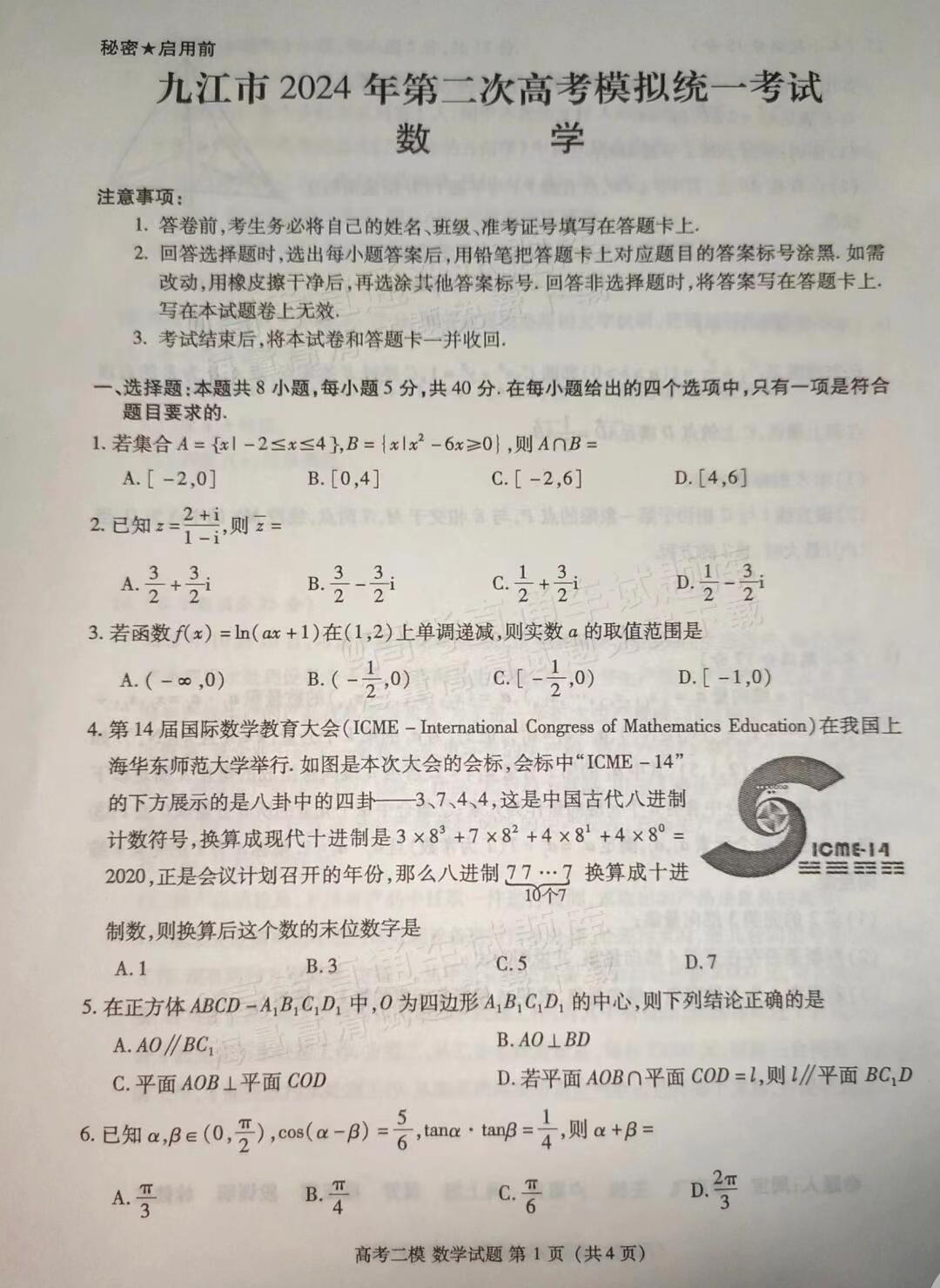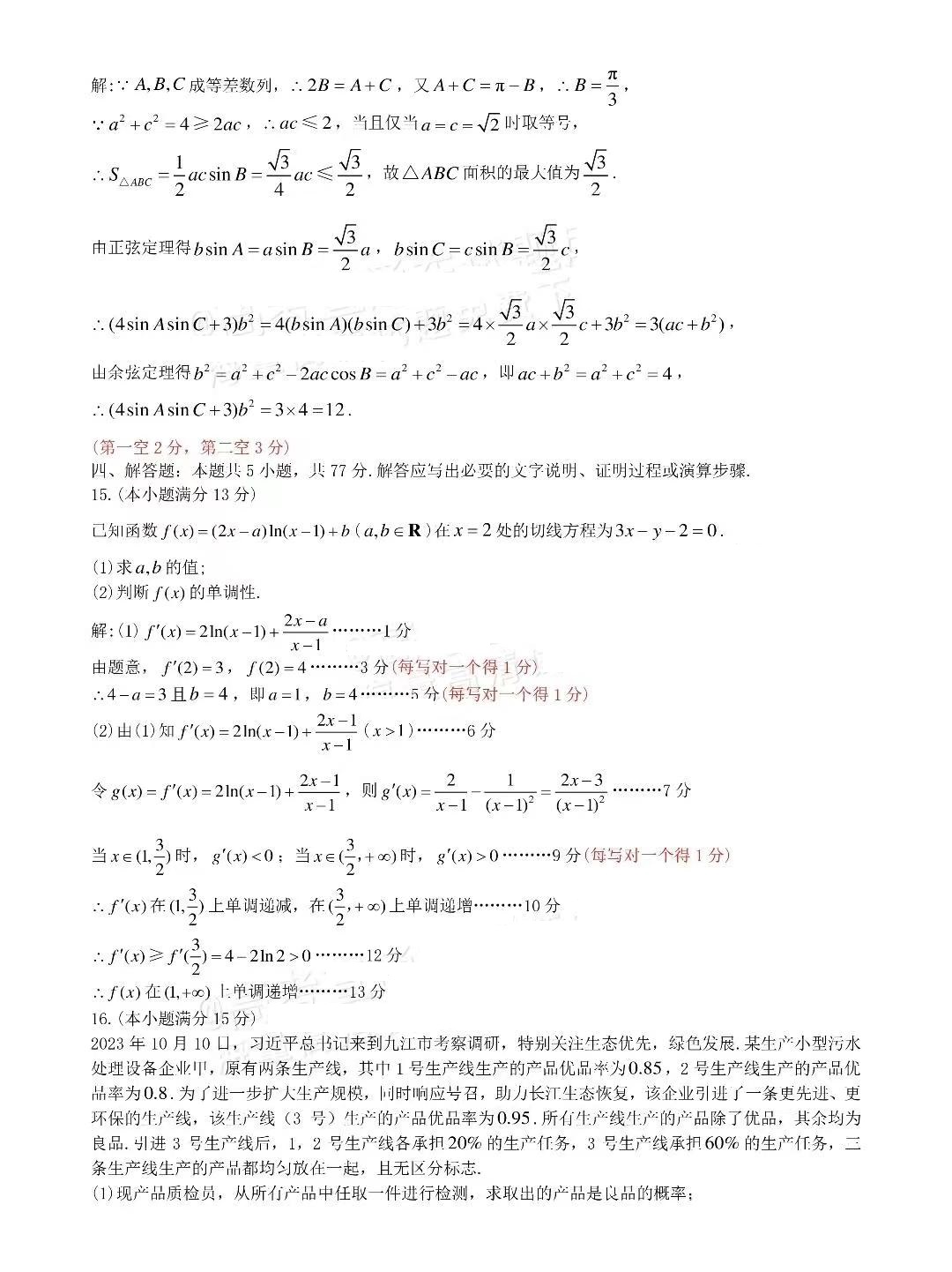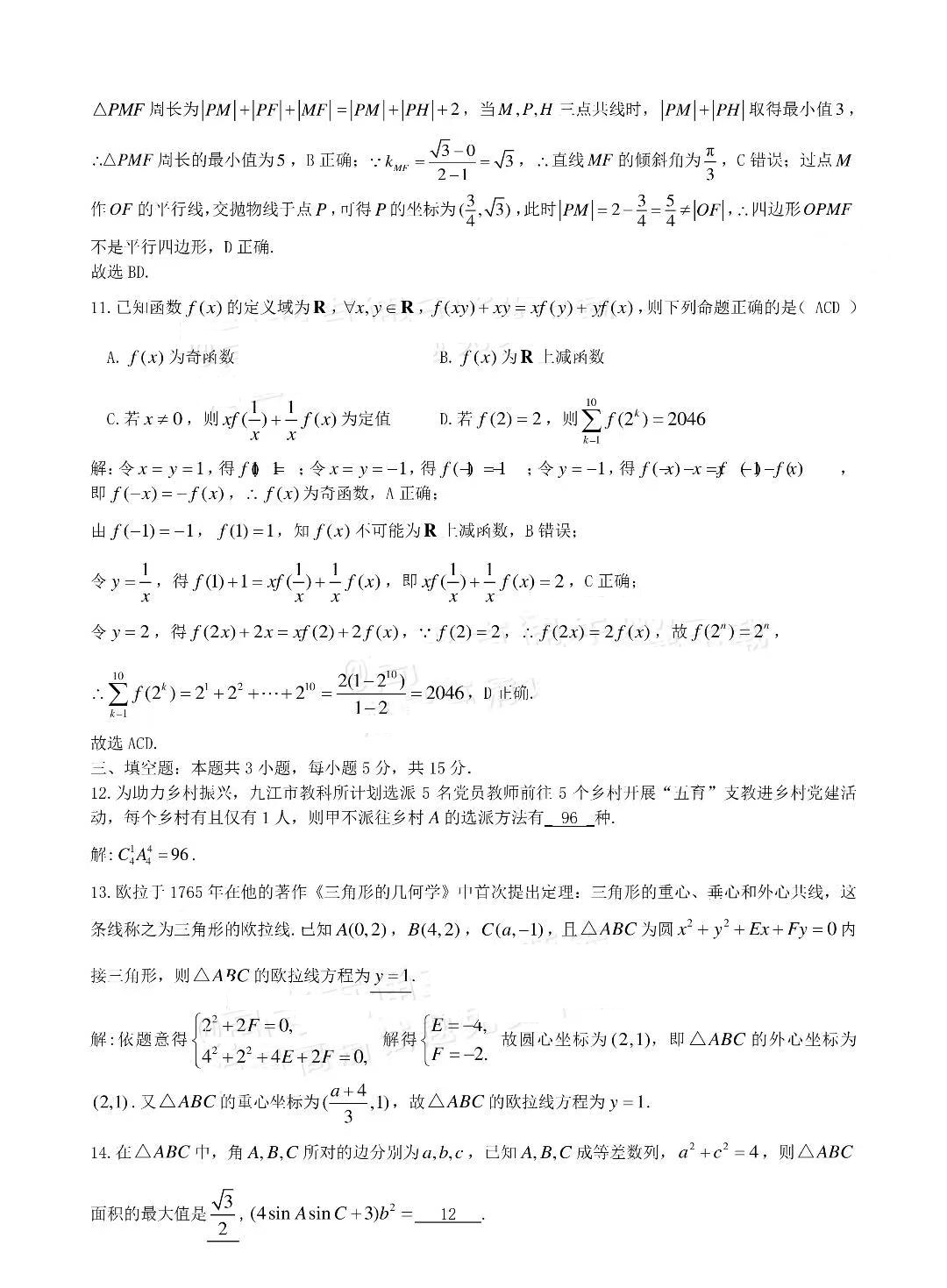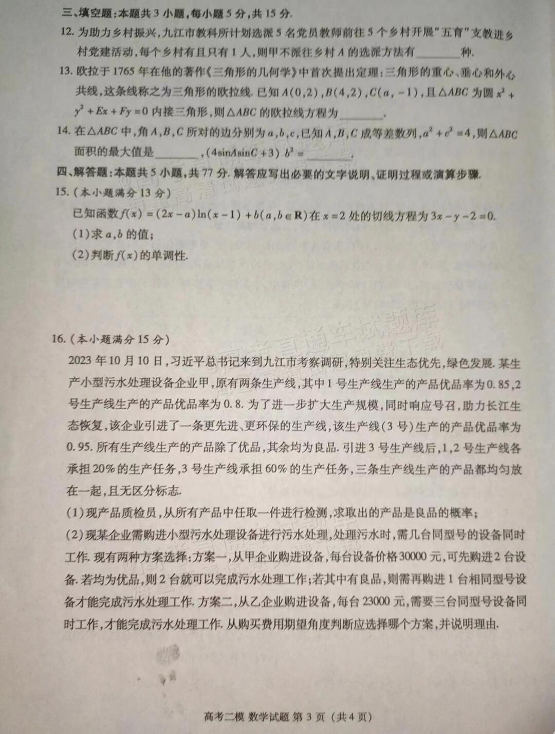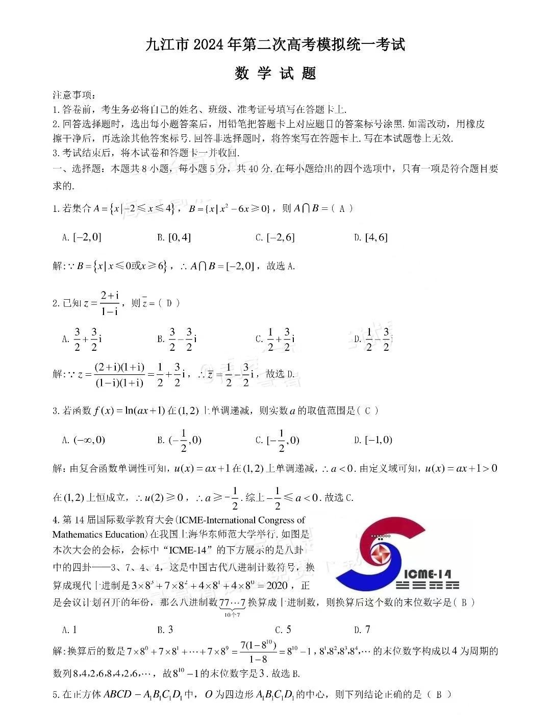 二、2024九江二模数学答案及试卷