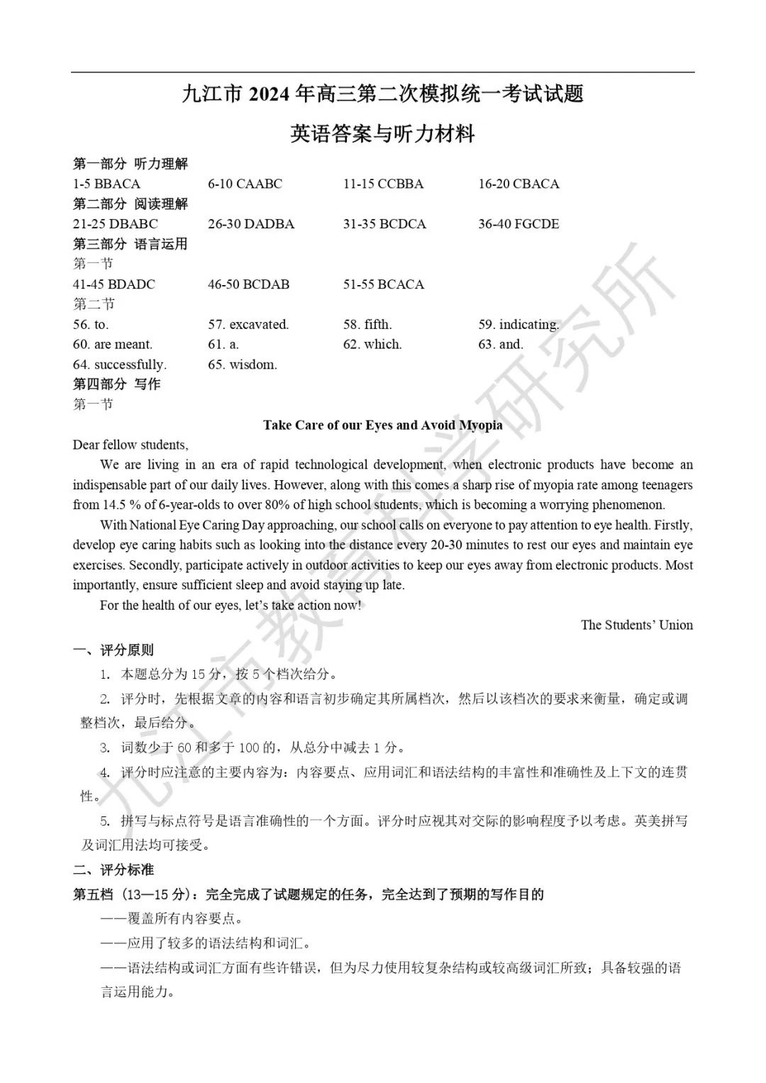 三、2024九江二模英语答案及试卷