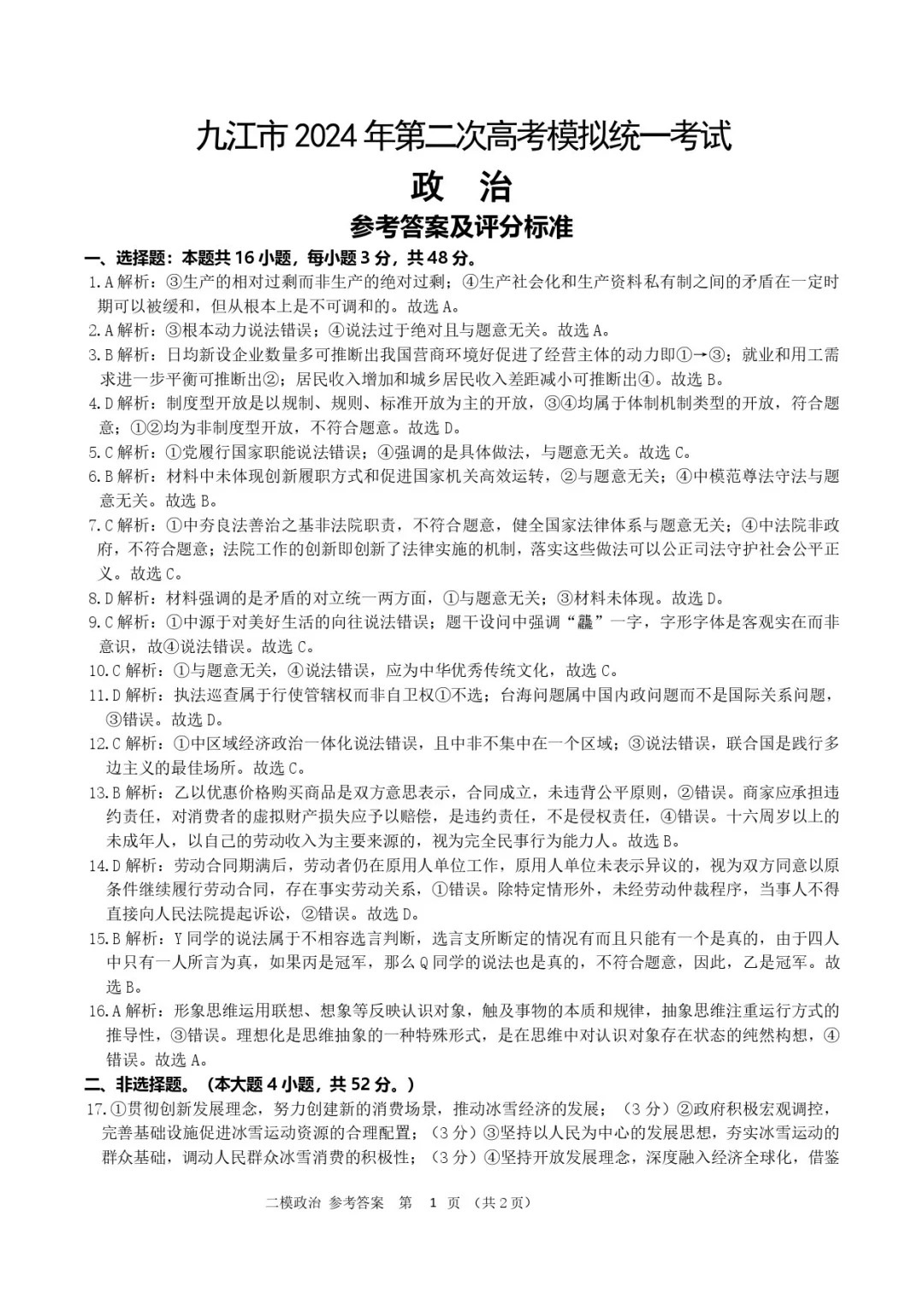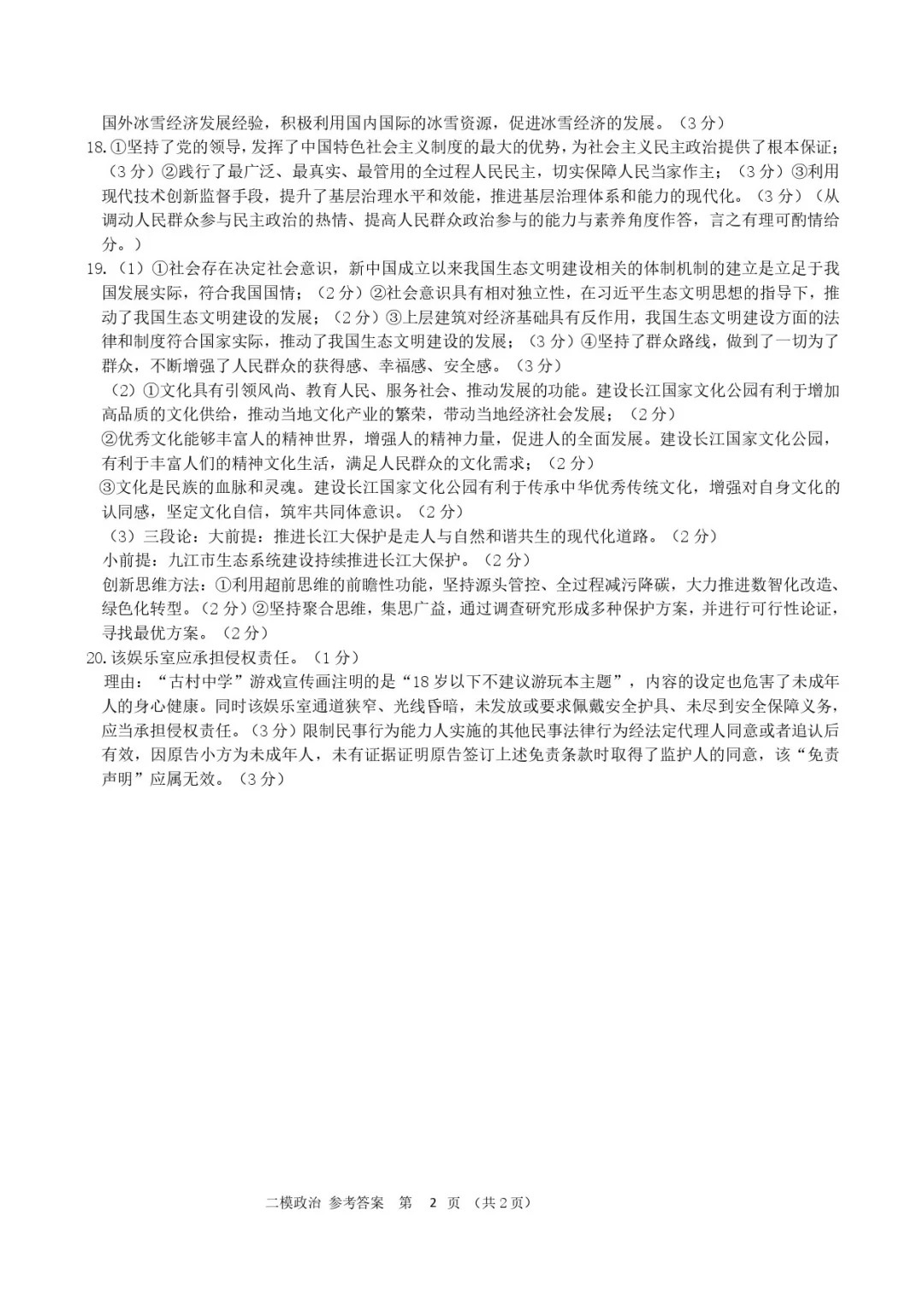 八、 2024九江二模政治答案及试卷