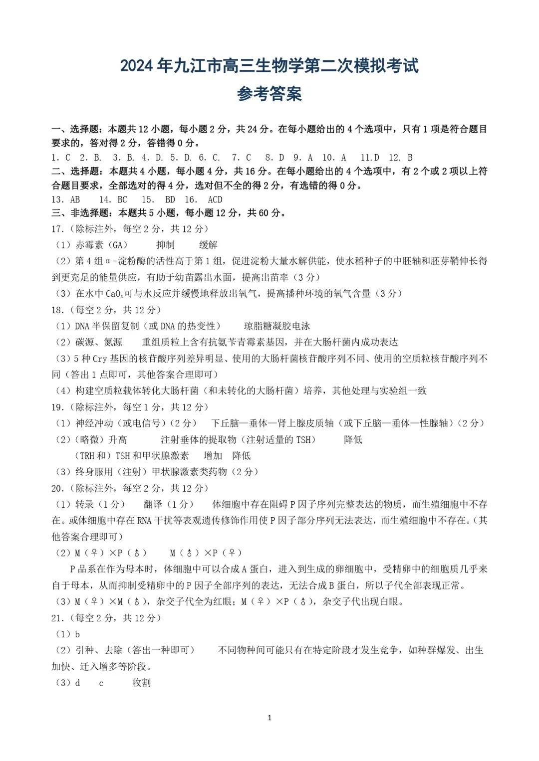 九、2024九江二模生物答案及试卷
