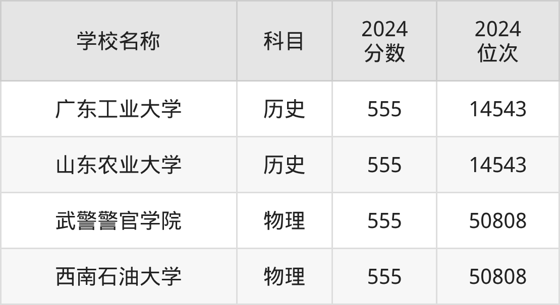 其中,物理组555分位于四川的学校有武警警官学院。历史组555分位于广东的学校有广东工业大学。