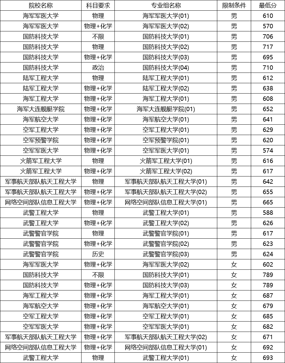 国防科技大学继续占据分数顶峰,其“不限”与“物理+化学”专业组女生最低分均高达789分,显示出女生报考顶尖军校的极高门槛。武警工程大学“物理”专业组女生也达693分,网络空间部队信息工程大学为692分,均远高于同专业男生分数。