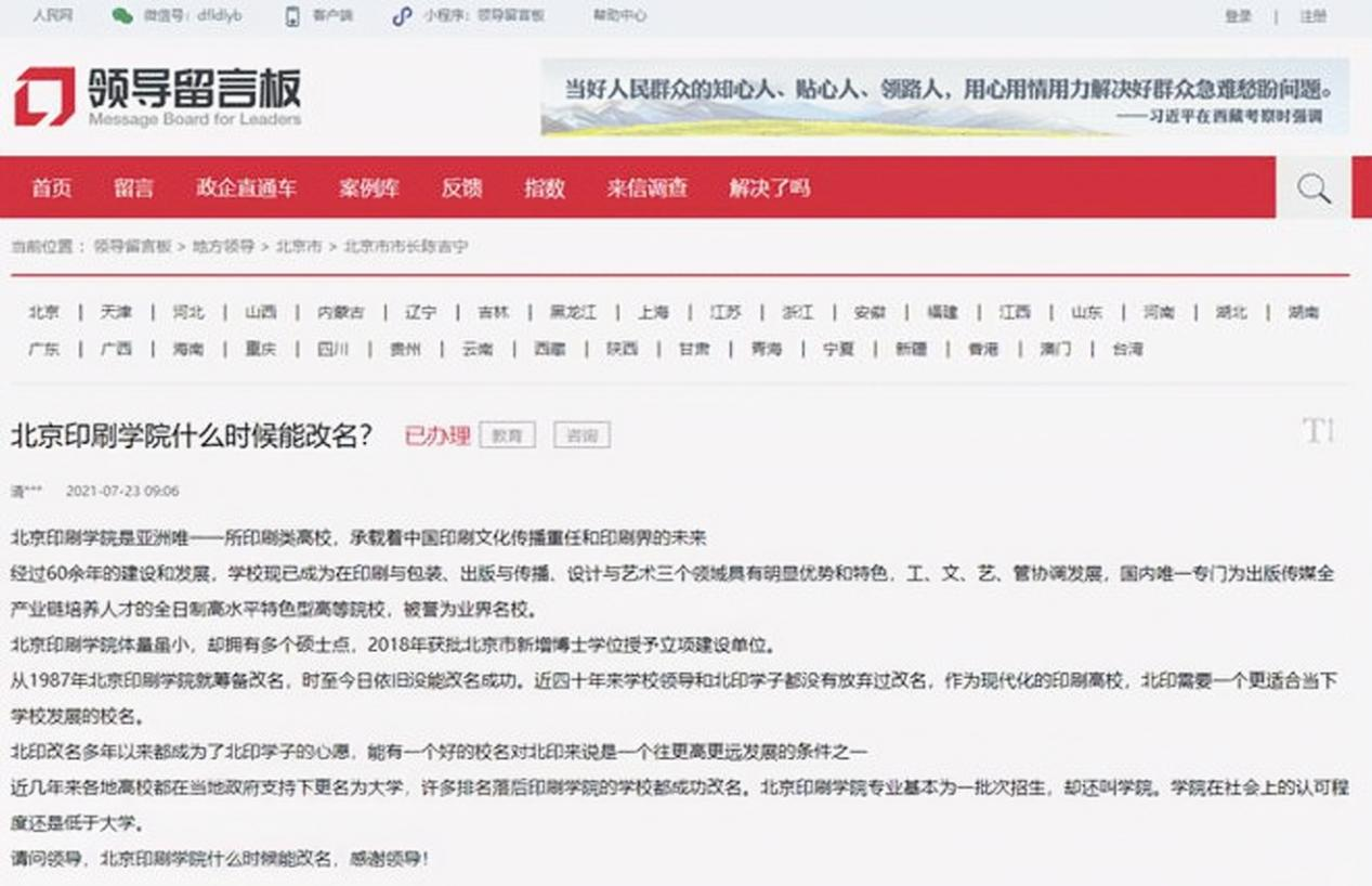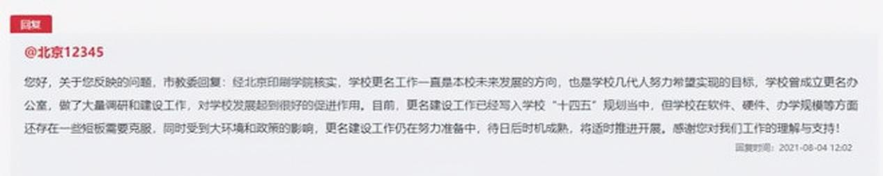 之前也有网友在领导留言板上咨询过关于北印改名的事情,对此,领导回应称,更名建设工作已经写入规划当中,将会适时推进。