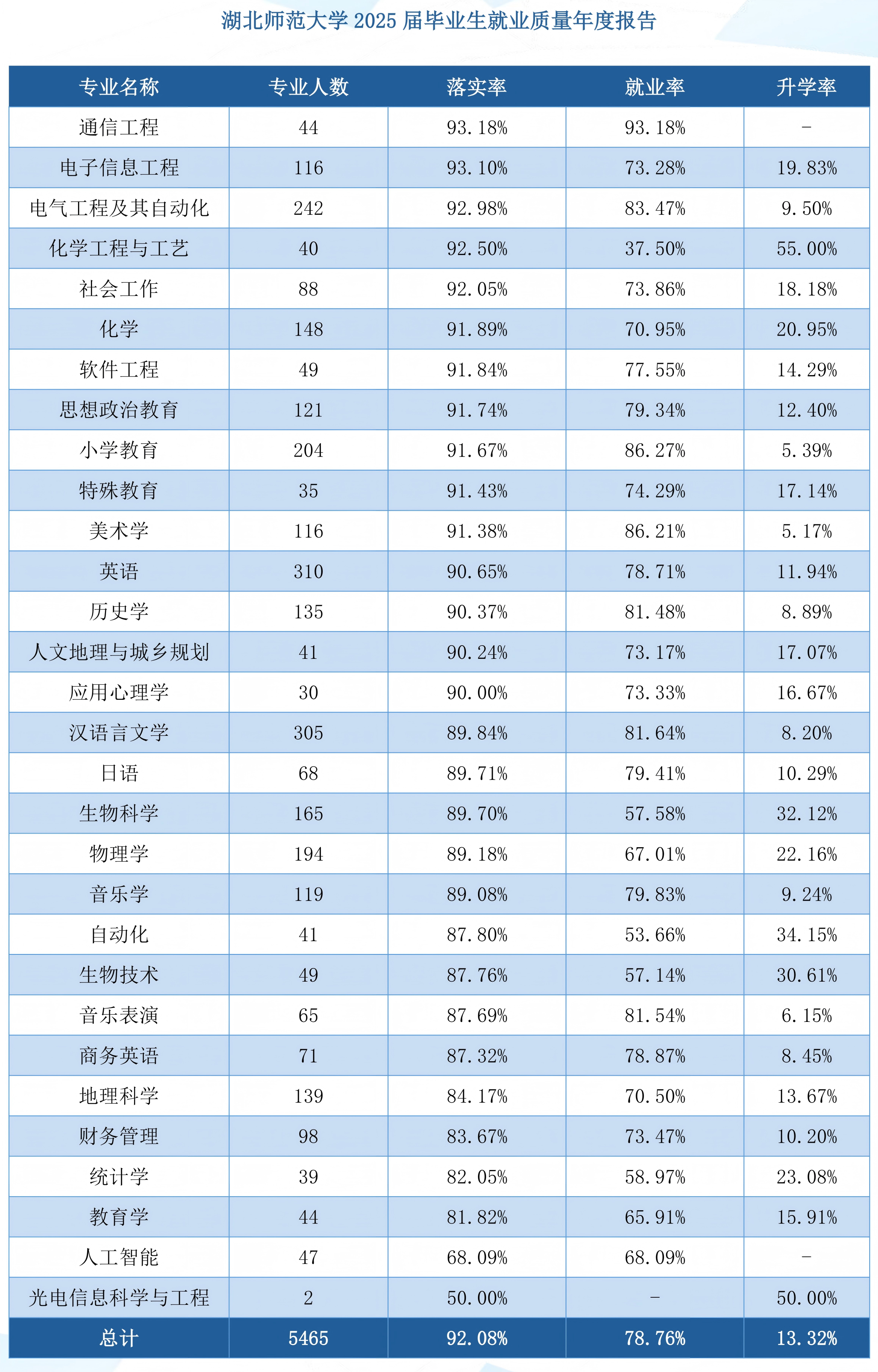 湖北师范大学各专业就业率、升学率请看下图: