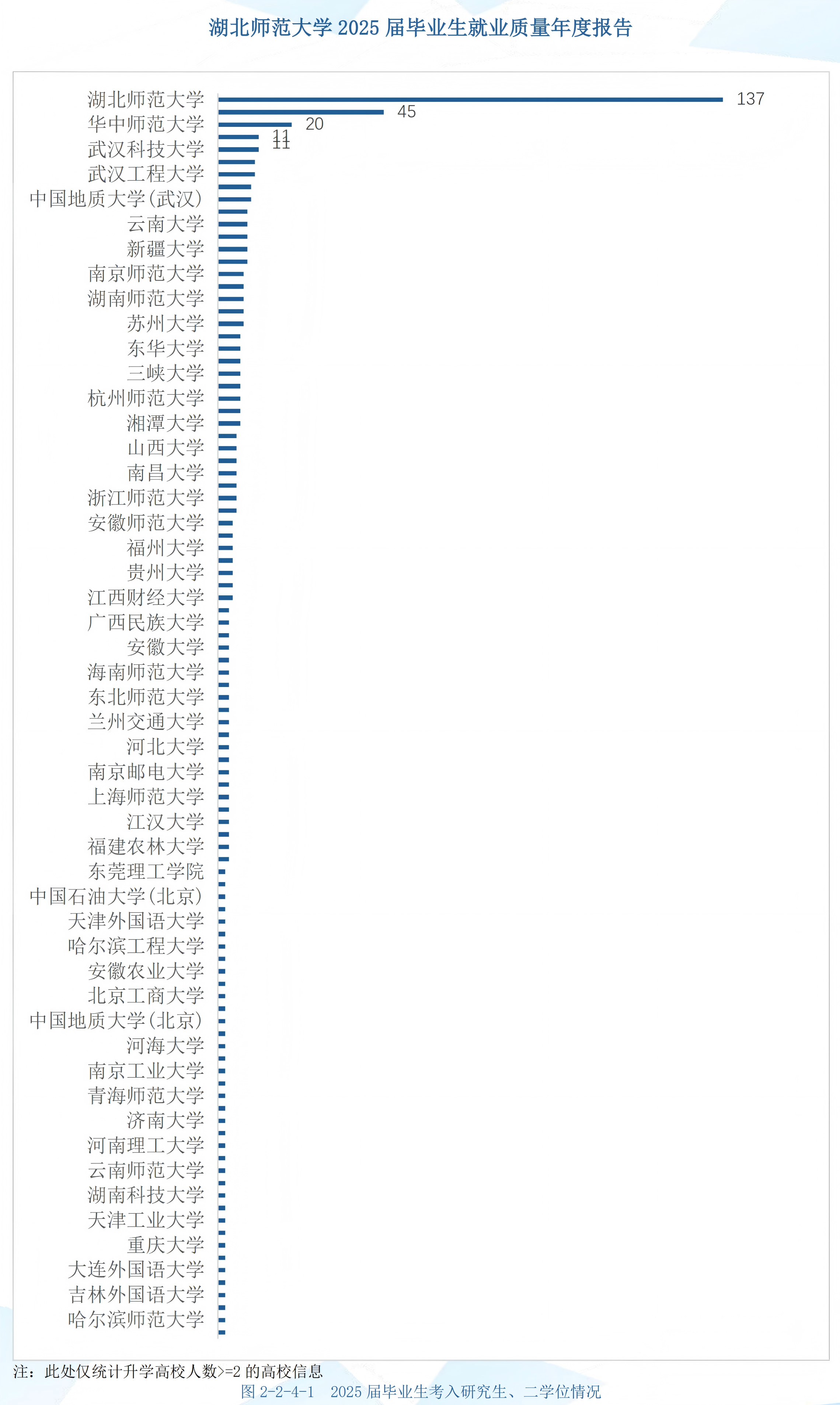 对有深造需求的家庭,除了升学率,升学质量更值得关注。在728名升学学生中,680人选择国内读研,仅2人考入二学位;读研学生里,137人留在本校,45人考入华中师范大学(双一流、211院校)。