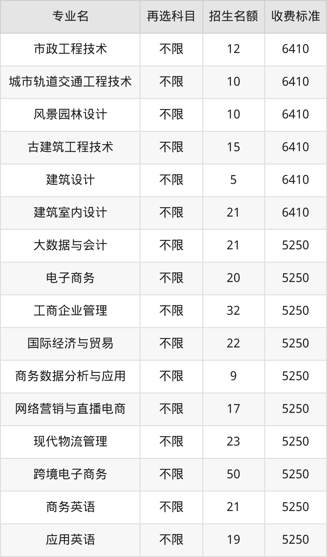 广东建设职业技术学院在历史组专科高职批招生的各个专业,每年的学费是5250元-18000元。招生人数最多的专业是跨境电子商务,2025年招50人,学费是5250元。