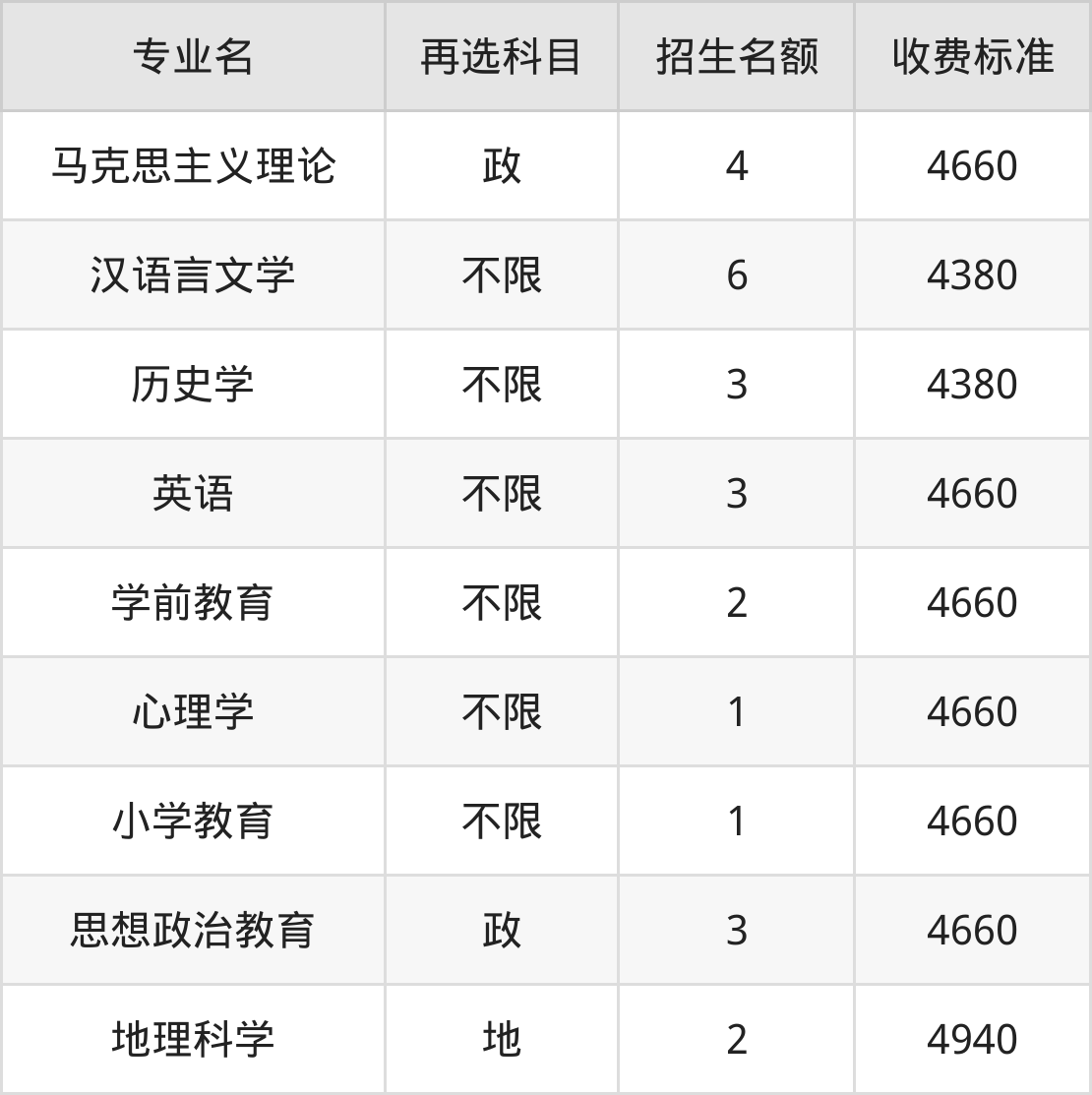 江西师范大学在历史组本科提前批招生的各个专业,每年的学费是4380元-4940元。招生人数最多的专业是汉语言文学,2024年招6人,学费是4380元。