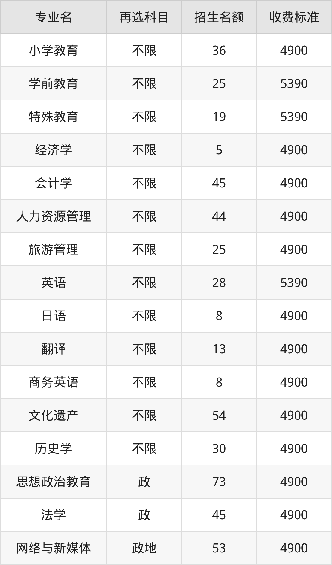 淮北师范大学在历史组本科批招生的各个专业,每年的学费是4900元-5390元。招生人数最多的专业是汉语言文学,2025年招134人,学费是5390元。