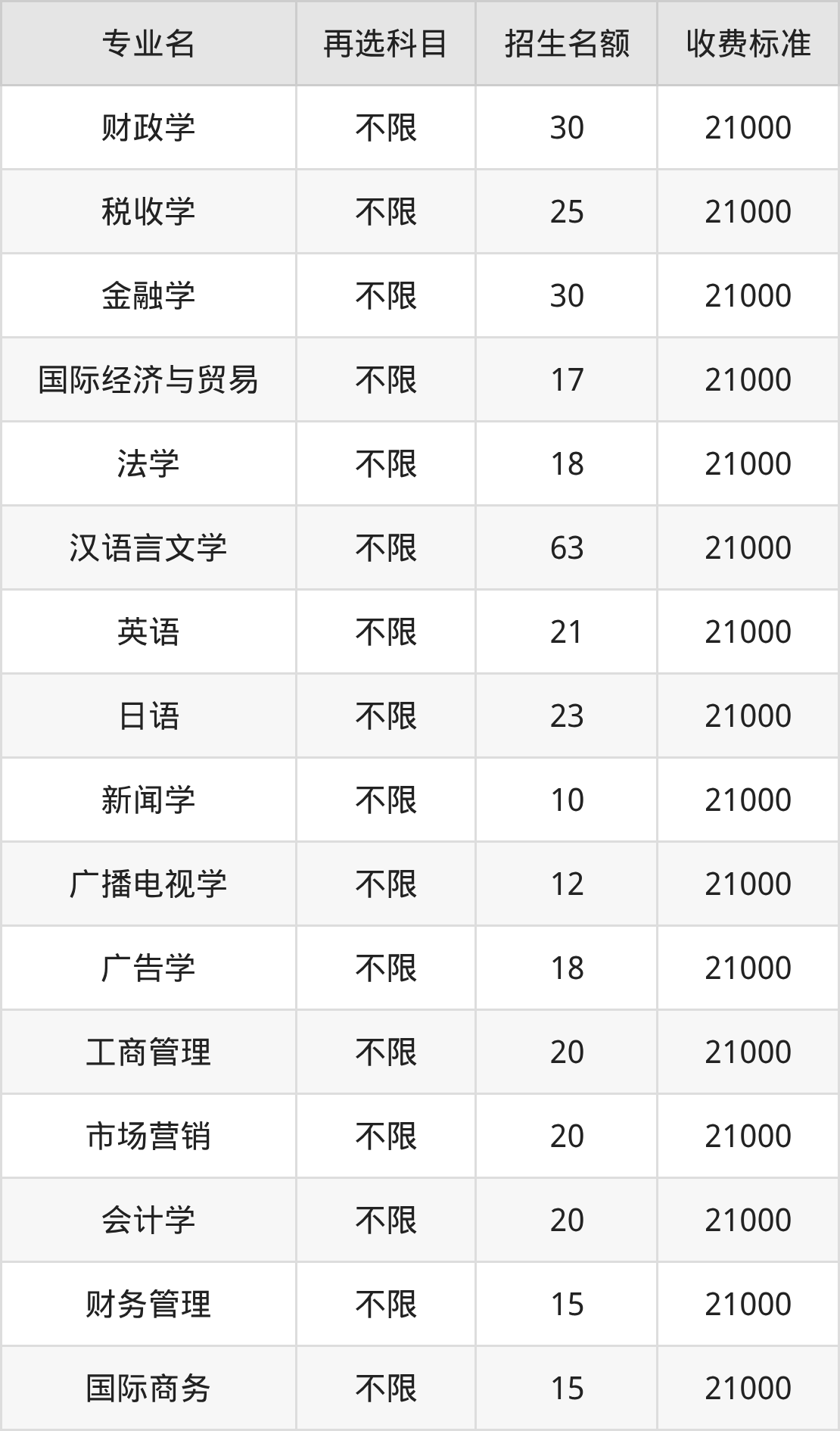 厦门大学嘉庚学院在历史组本科批招生的各个专业,每年的学费是21000元。招生人数最多的专业是汉语言文学,2025年招63人,学费是21000元。