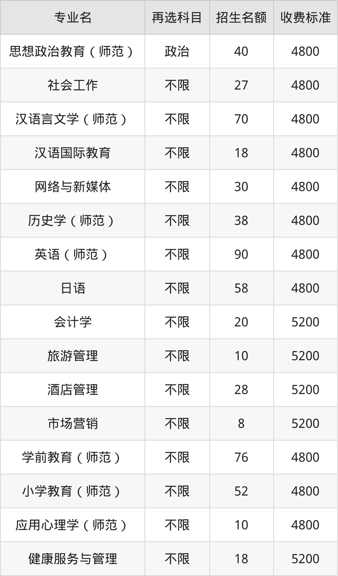 鞍山师范学院在历史组本科批招生的各个专业,每年的学费是4800元-5200元。招生人数最多的专业是英语,2025年招90人,学费是4800元。