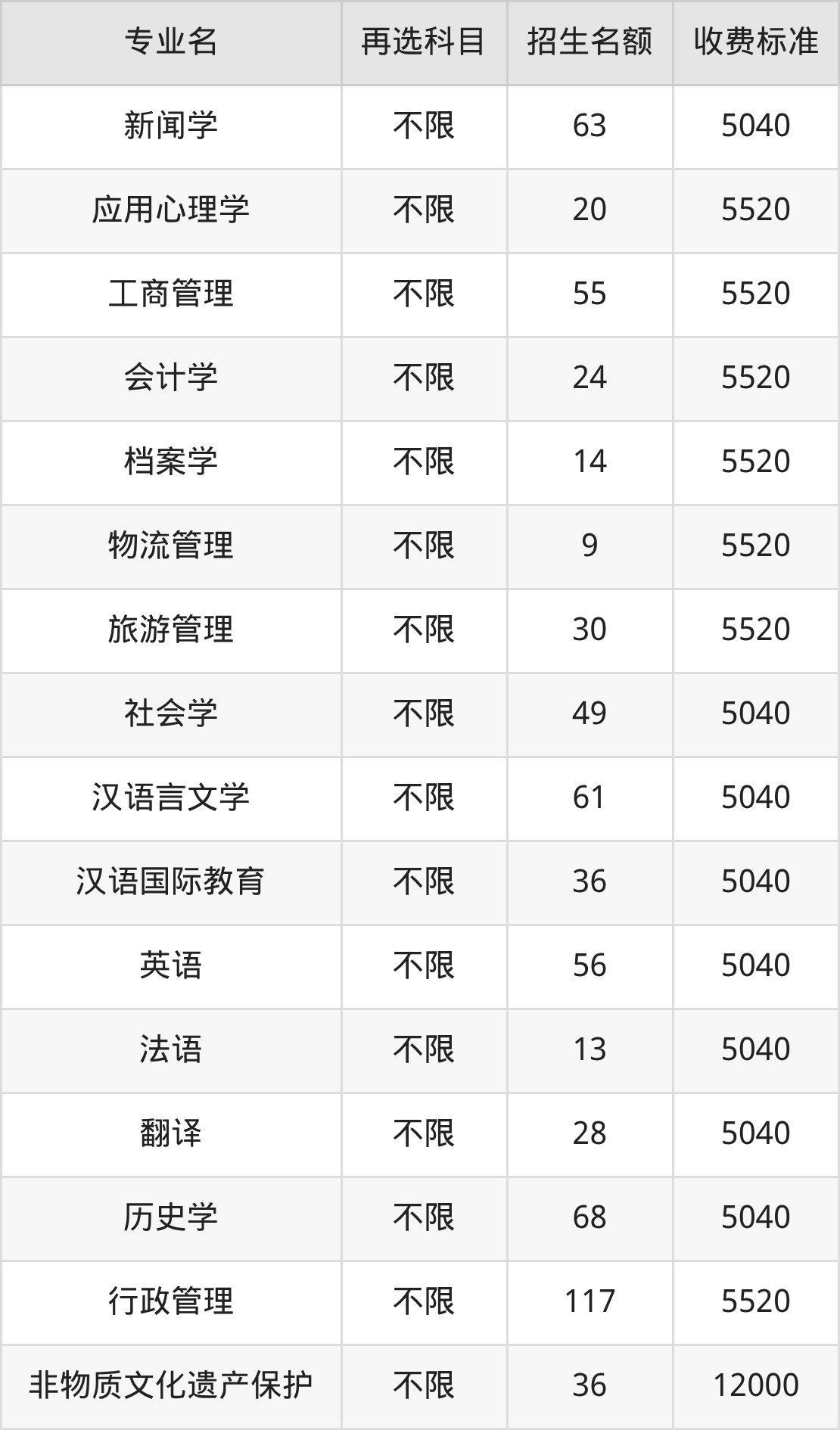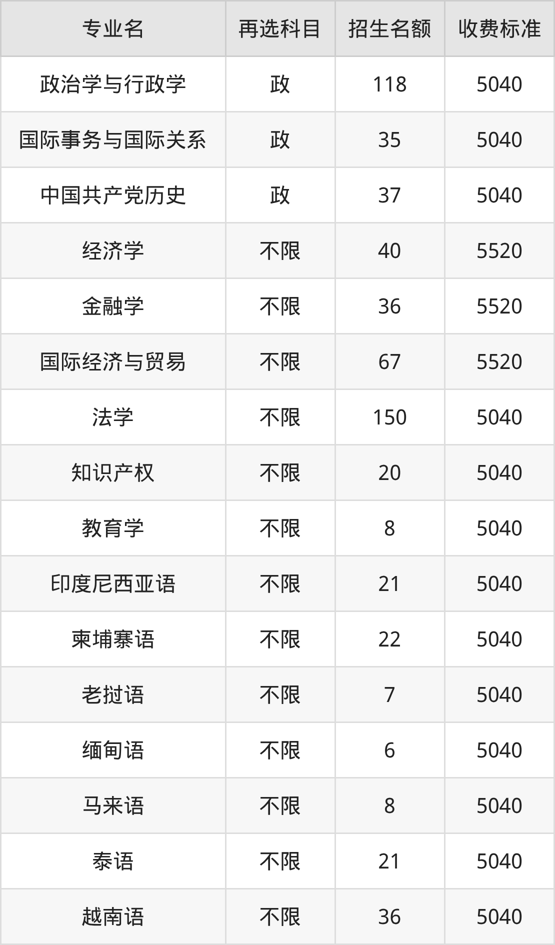 广西民族大学在历史组本科批招生的各个专业,每年的学费是4200元-40000元。招生人数最多的专业是法学,2025年招150人,学费是5040元。