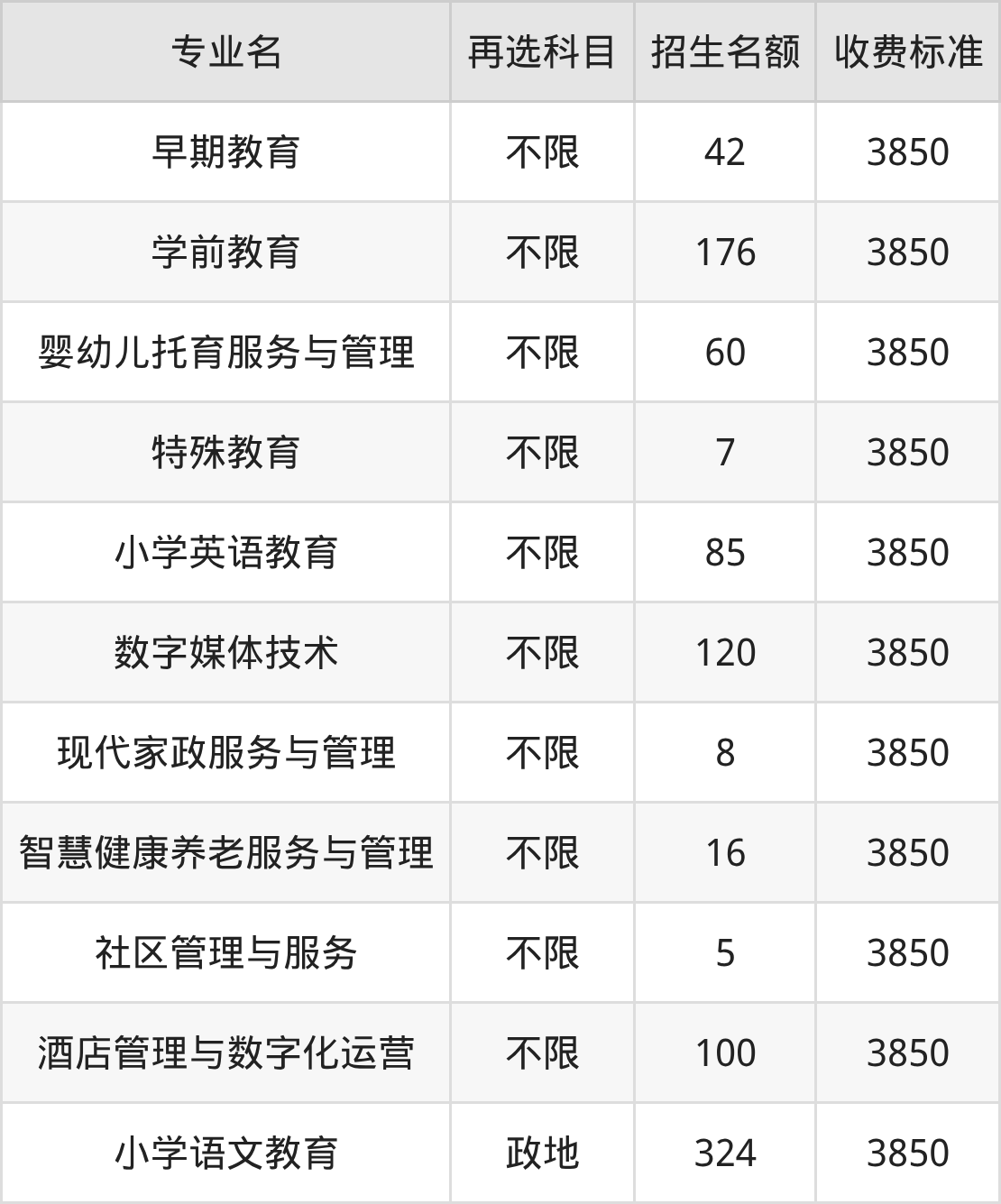 黔南民族幼儿师范高等专科学校在历史组高职专科批招生的各个专业,每年的学费是3850元。招生人数最多的专业是小学语文教育,2025年招324人,学费是3850元。