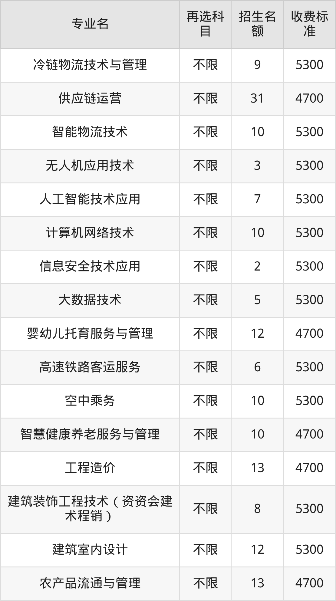江苏商贸职业学院在历史组专科批招生的各个专业,每年的学费是4700元-5300元。招生人数最多的专业是供应链运营,2025年招31人,学费是4700元。