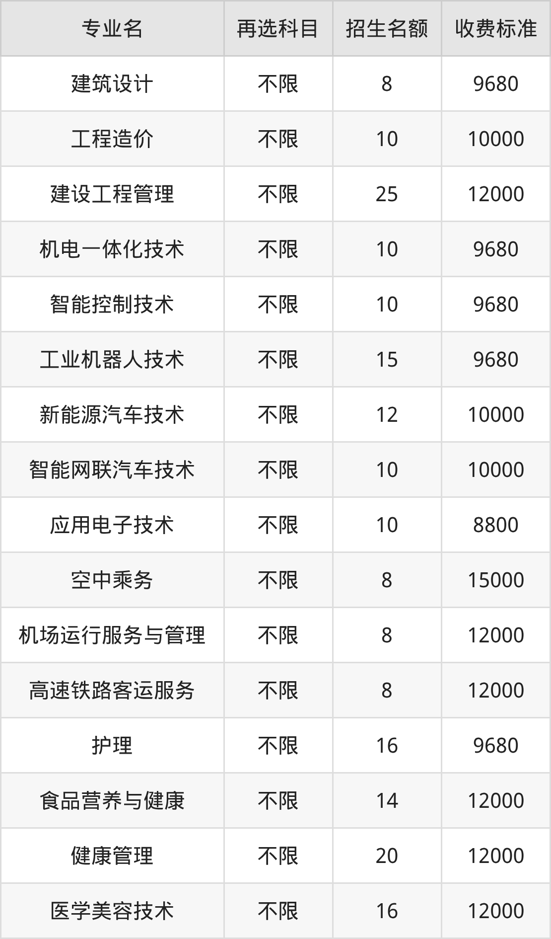 | 高职高专批 | 物理 | 西式烹饪工艺 | 10 |