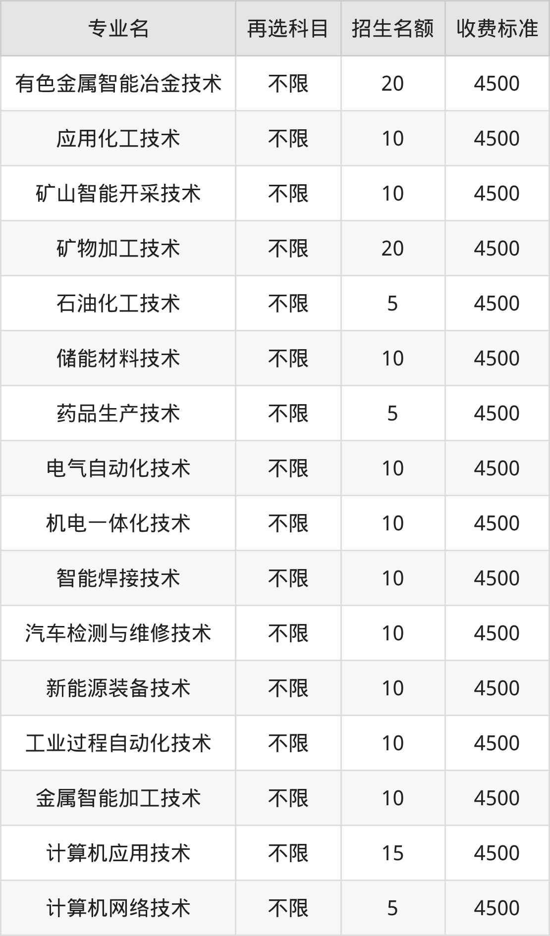 甘肃有色冶金职业技术学院在历史组高职专科批招生的各个专业,每年的学费是4500元。招生人数最多的专业是有色金属智能冶金技术,2025年招20人,学费是4500元。