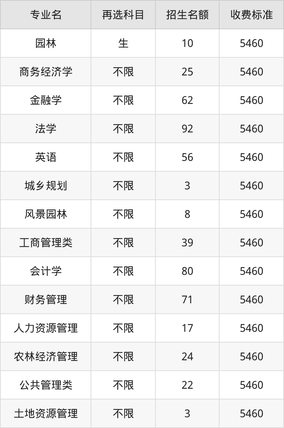 福建农林大学在历史组本科批招生的各个专业,每年的学费是5460元。招生人数最多的专业是法学,2025年招92人,学费是5460元。