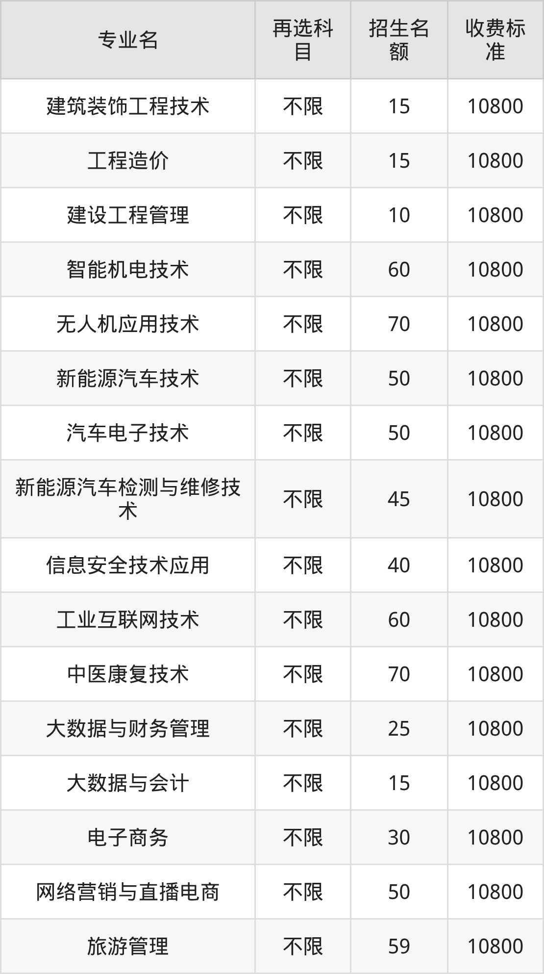 洛阳商业职业学院在历史组高职专科批招生的各个专业,每年的学费是10800元。招生人数最多的专业是无人机应用技术,2025年招70人,学费是10800元。