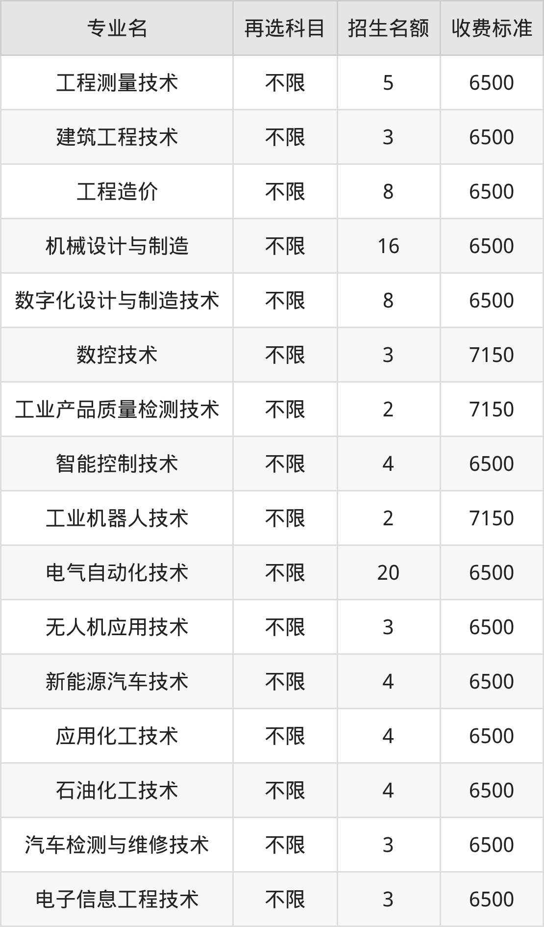 陕西国防工业职业技术学院在历史组高职专科批招生的各个专业,每年的学费是6500元-7150元。招生人数最多的专业是电气自动化技术,2025年招20人,学费是6500元。