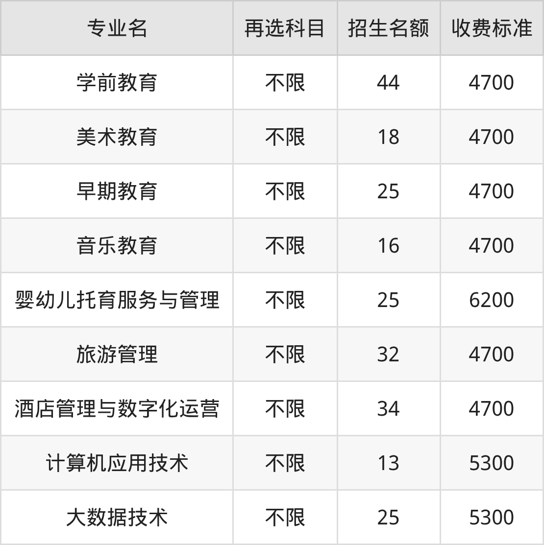 宿迁幼儿师范高等专科学校在历史组专科批招生的各个专业,每年的学费是4700元-6200元。招生人数最多的专业是学前教育,2025年招44人,学费是4700元。