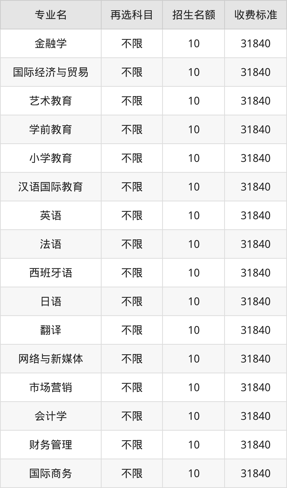 | 本科批 | 历史 | 金融学 | 10 |