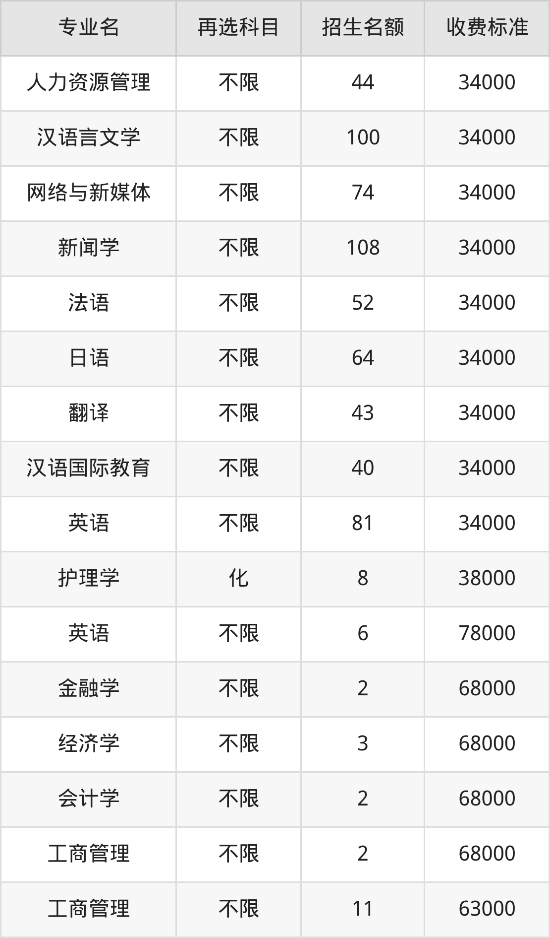 广州南方学院在历史组本科批招生的各个专业,每年的学费是34000元-78000元。招生人数最多的专业是新闻学,2025年招108人,学费是34000元。