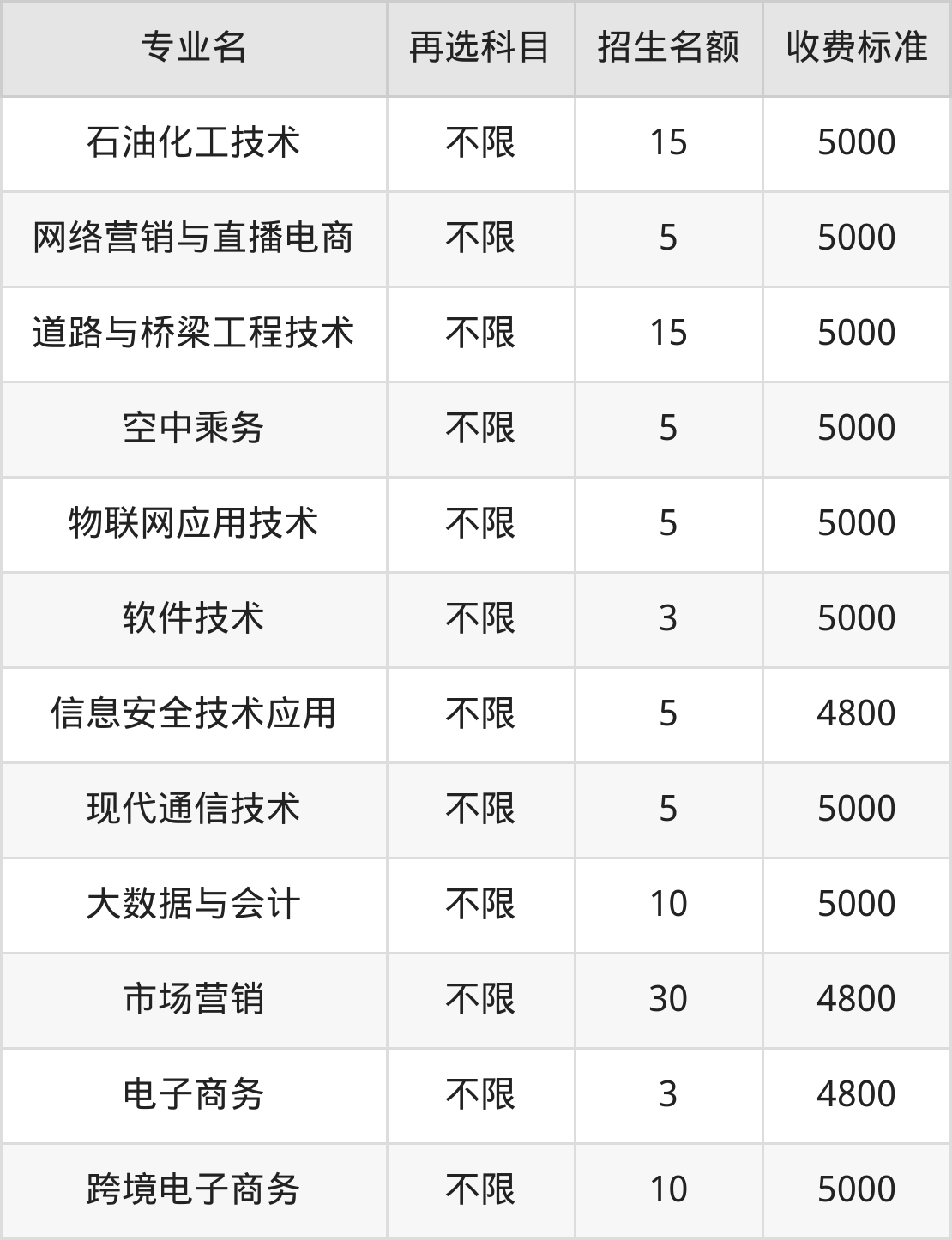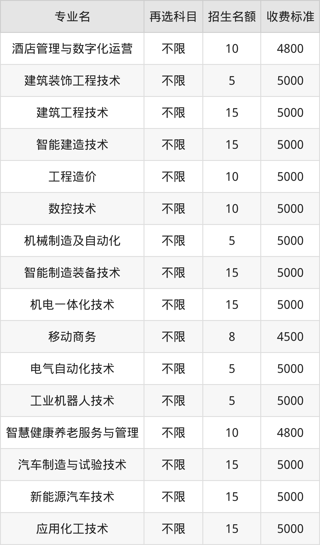 | 高职专科批 | 历史 | 工程造价 | 10 |
