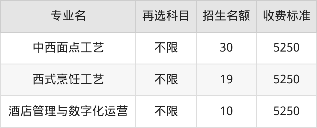 | 专科高职批 | 历史 | 中西面点工艺 | 30 |