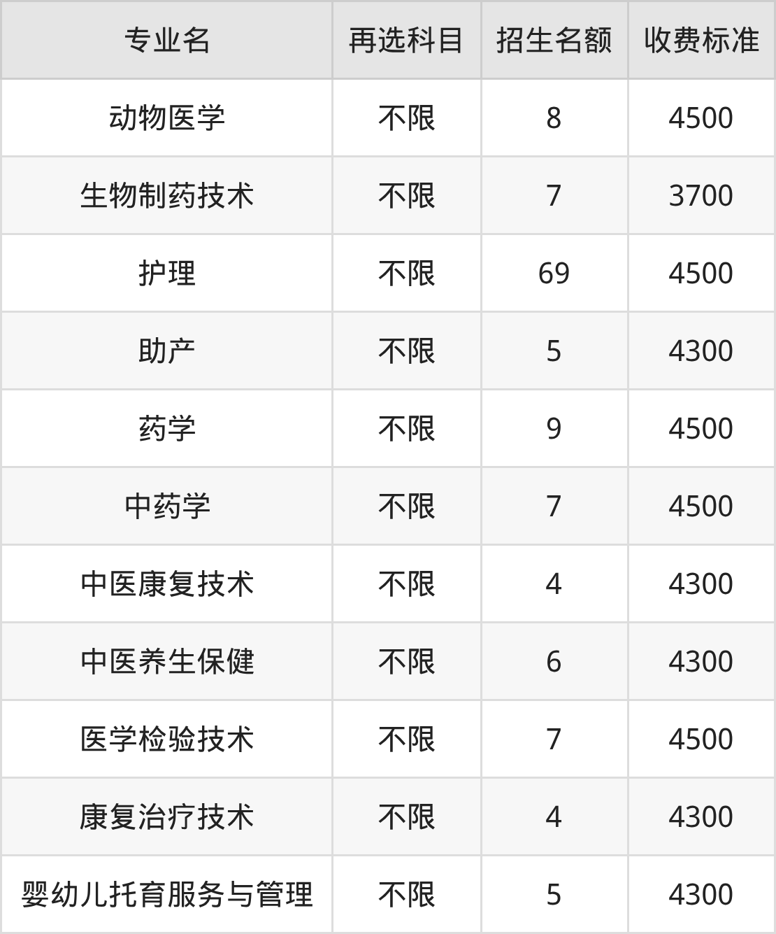 通化医药健康职业学院在历史组专科高职批招生的各个专业,每年的学费是3700元-4500元。招生人数最多的专业是护理,2025年招69人,学费是4500元。