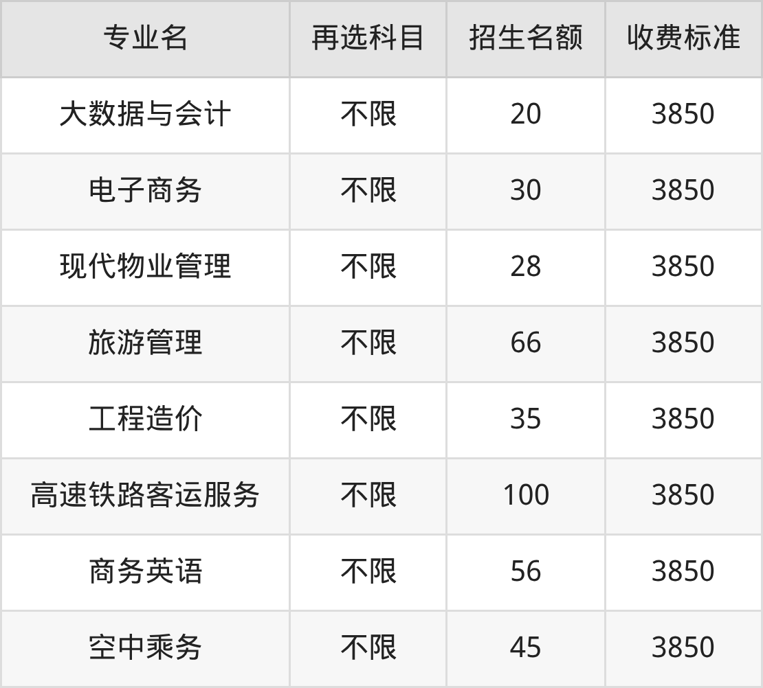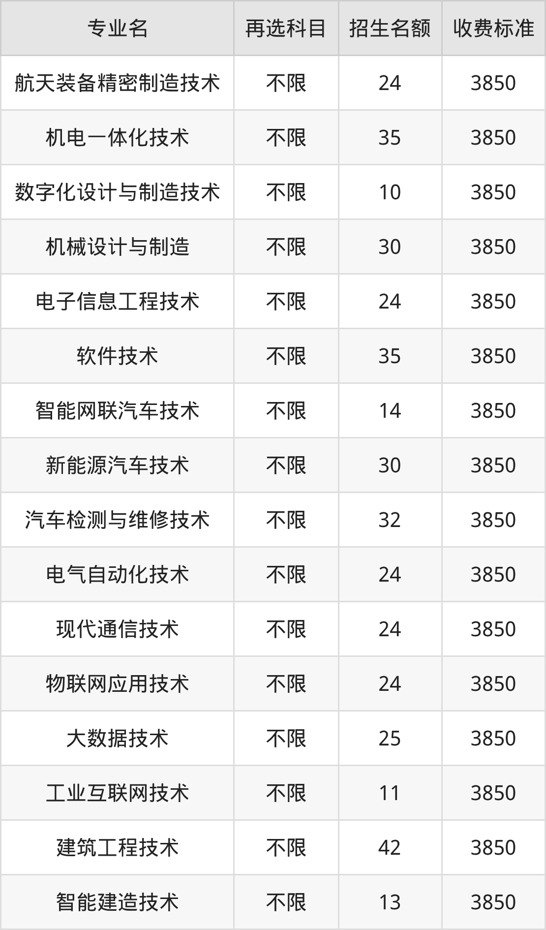 贵州航天职业技术学院在历史组高职专科批招生的各个专业,每年的学费是3850元。招生人数最多的专业是高速铁路客运服务,2025年招100人,学费是3850元。