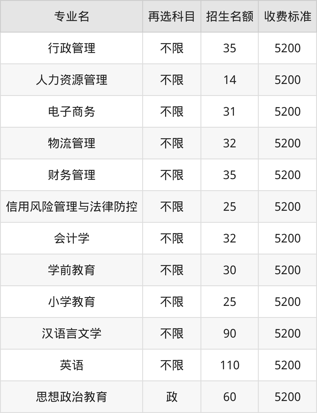 宿迁学院在历史组本科批招生的各个专业,每年的学费是5200元。招生人数最多的专业是英语,2025年招110人,学费是5200元。