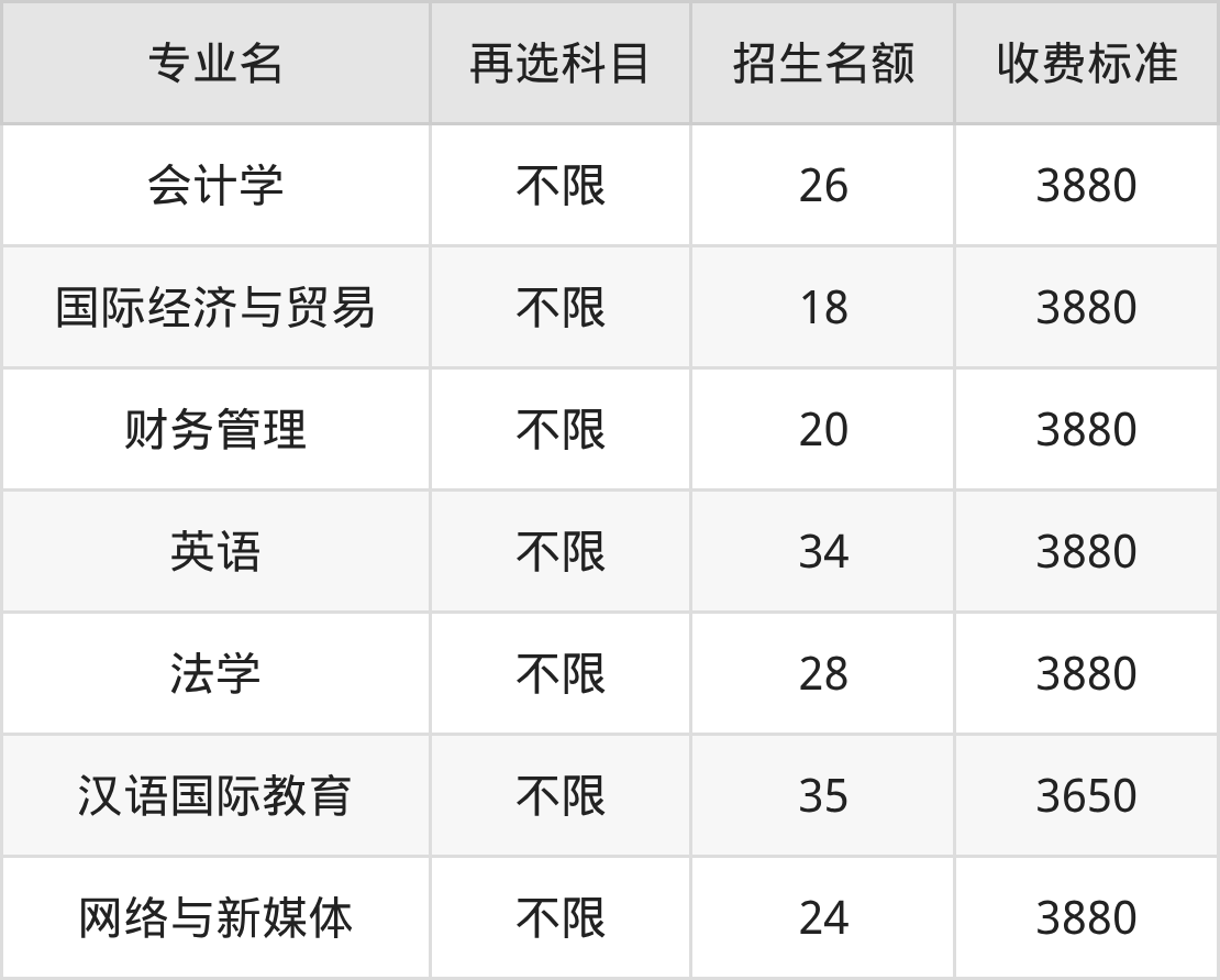 赣东学院在历史组本科批招生的各个专业,每年的学费是3650元-3880元。招生人数最多的专业是汉语国际教育,2025年招35人,学费是3650元。