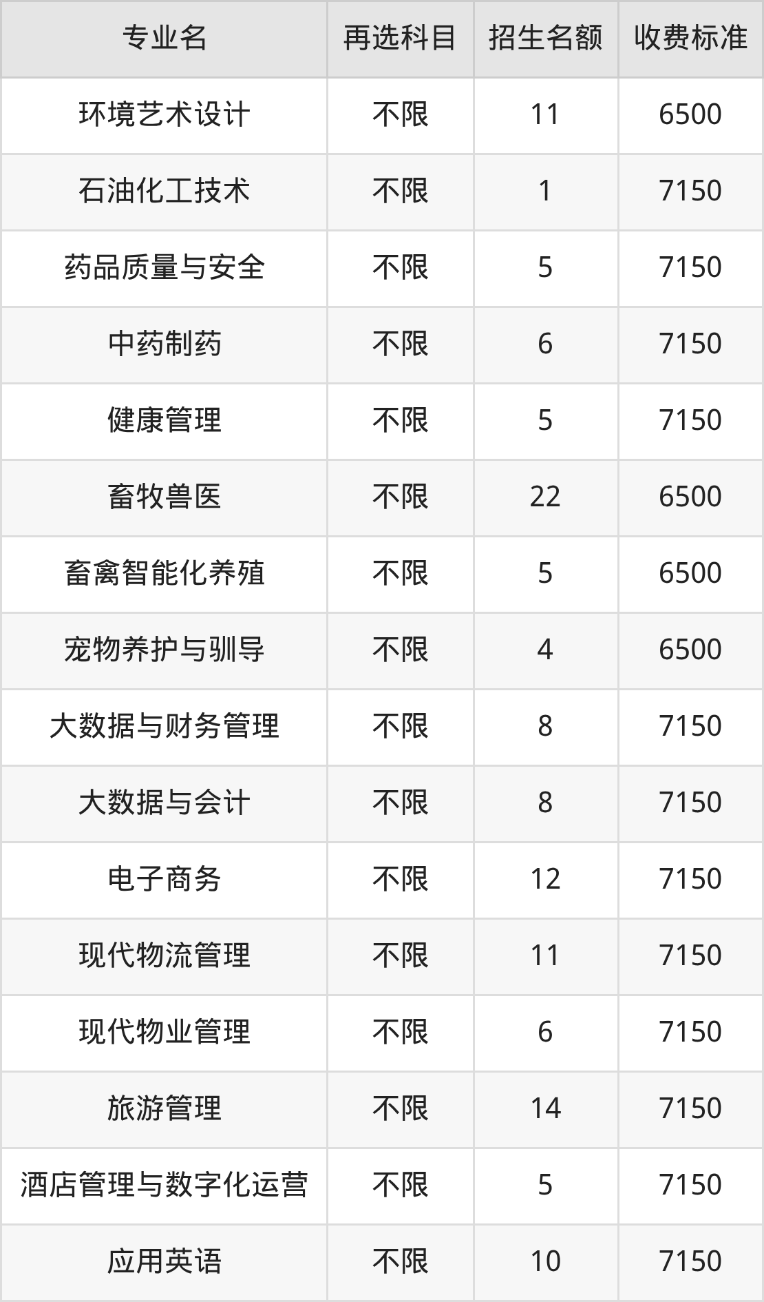 陕西农林职业技术大学在历史组高职专科批招生的各个专业,每年的学费是6500元-7150元。招生人数最多的专业是工程造价,2025年招22人,学费是7150元。
