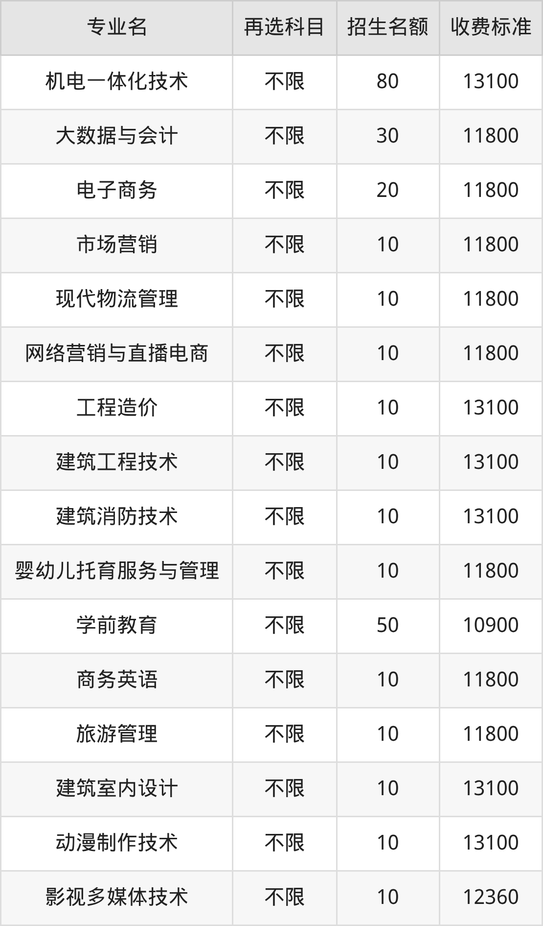 | 高职专科批 | 历史 | 工程造价 | 10 |