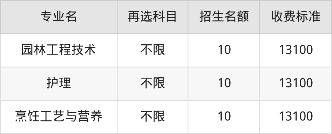 | 高职专科批 | 物理 | 烹饪工艺与营养 | 10 |