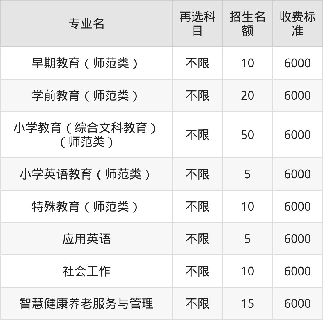 福建幼儿师范高等专科学校在历史组专科批招生的各个专业,每年的学费是6000元。招生人数最多的专业是小学教育,2025年招50人,学费是6000元。