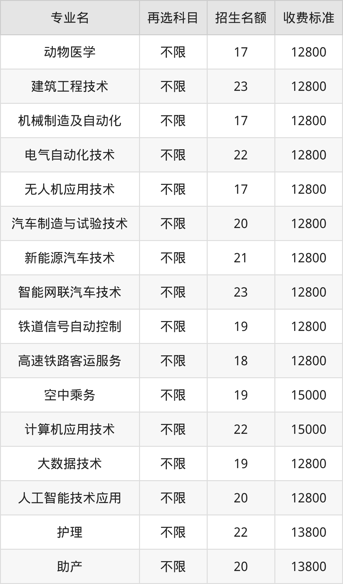 | 专科高职批 | 历史 | 汽车制造与试验技术 | 20 |