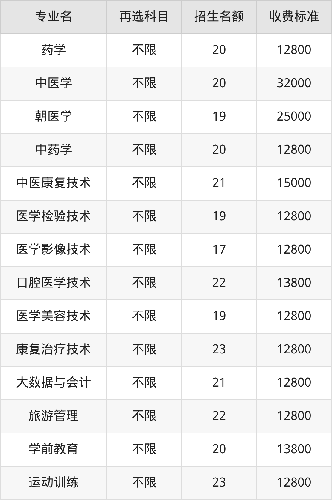 | 专科高职批 | 历史 | 中医学 | 20 |